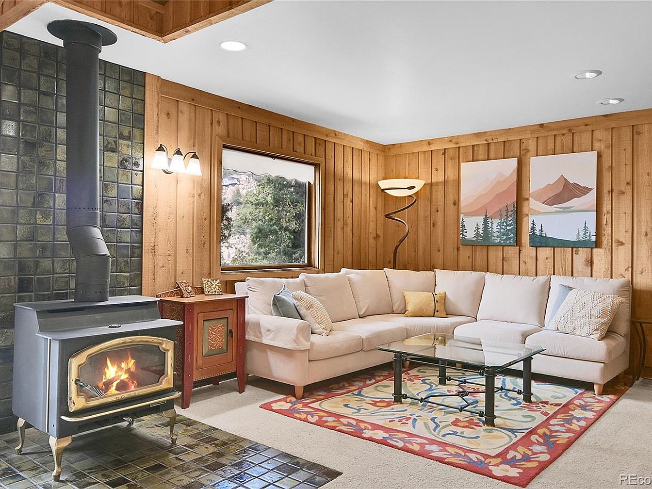 Warm wood paneling lines the walls, creating a rustic atmosphere. A modern wood-burning stove with a black chimney pipe sits on elegant, glossy tile in the corner, providing a focal point and warmth. A large, L-shaped cream sectional sofa dominates the seating area, accented with pastel throw pillows. A glass-topped coffee table rests on a colorful area rug with red and yellow floral patterns. Two landscape paintings in soft mountain hues and a unique, spiral floor lamp add artistic touches. Natural light streams in through a window, enhancing the inviting, tranquil feel of this comfortable living space.