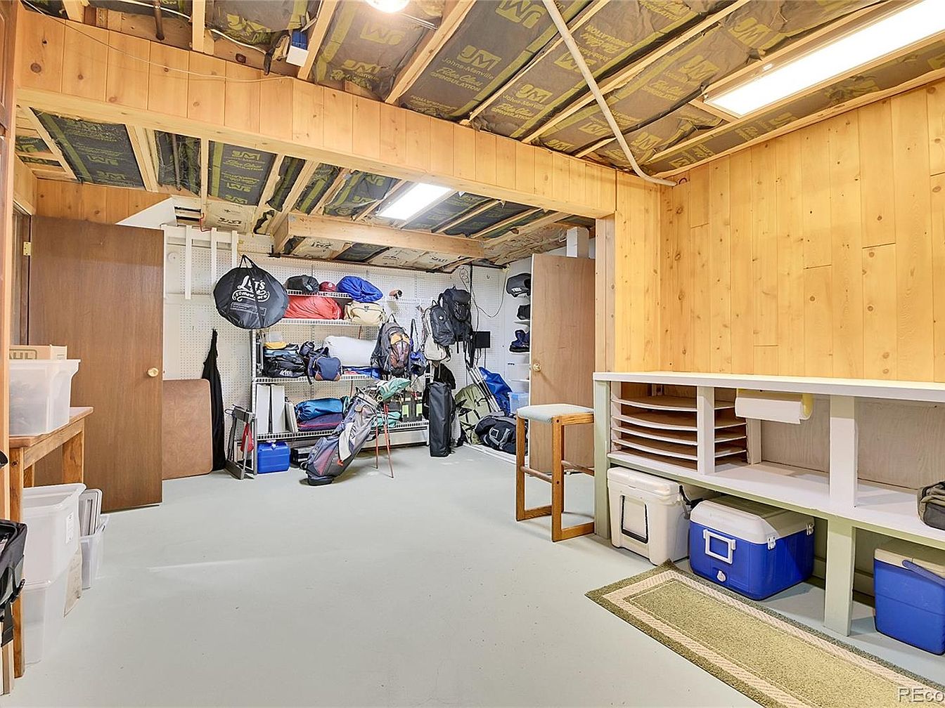 A spacious basement area designed for practical storage and organization, featuring exposed insulation in the ceiling and unfinished natural wood paneling walls for a rustic utilitarian feel. Fluorescent ceiling lights provide ample illumination. Open shelving along one wall is packed with outdoor gear, sports equipment, and backpacks, while additional coolers are neatly lined beneath a long built-in work counter. The concrete floor is painted a light gray, complemented by a narrow sage green runner rug, helping brighten the lower-level space. A small wooden stool and various labeled bins are neatly arranged, emphasizing function and order in the basement setting.