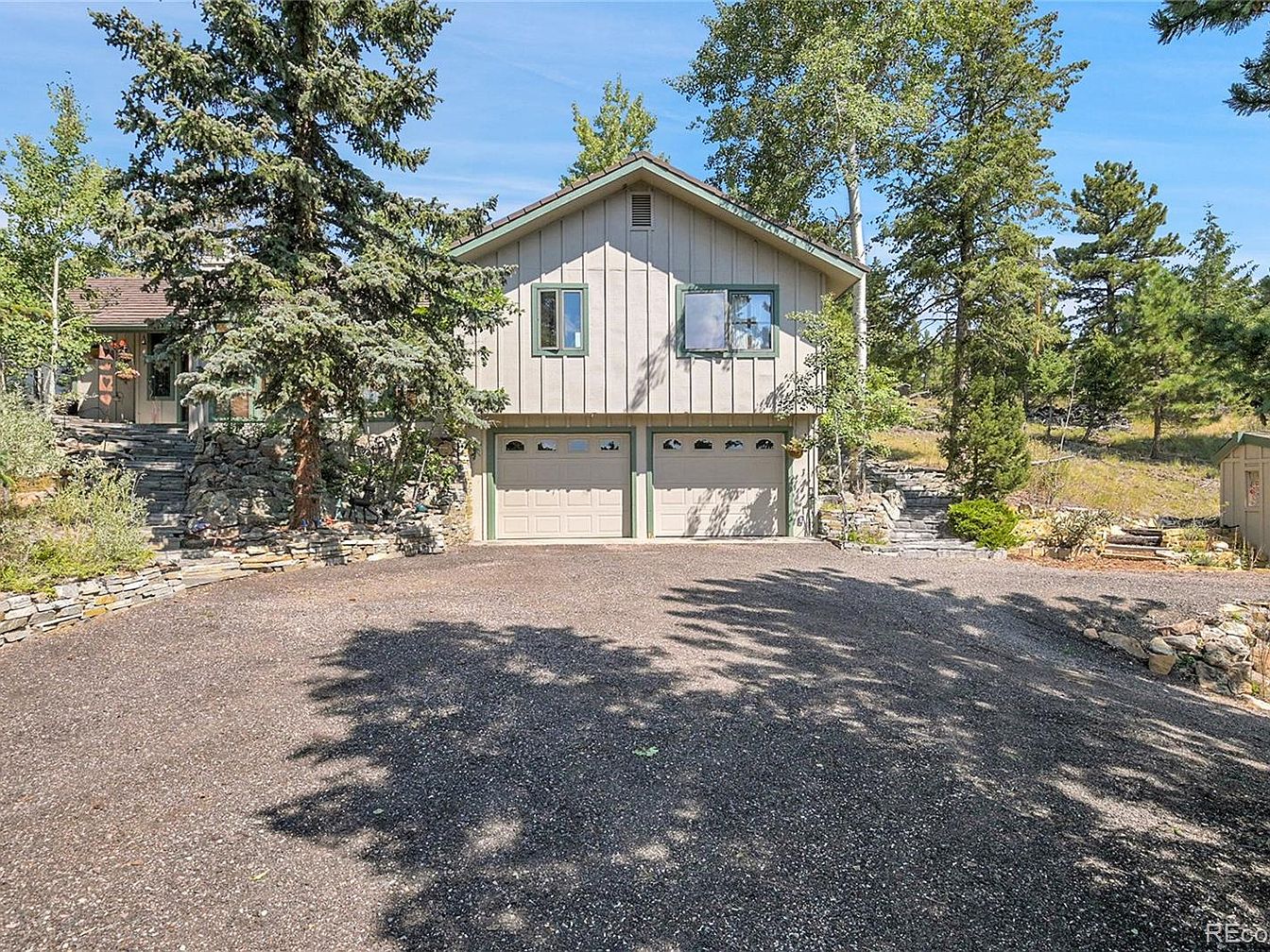 A broad gravel driveway leads up to a two-car garage with beige doors and soft green trim, set into a multi-level structure with vertical wood panel siding. To the left, a flight of rustic stone steps bordered by stacked stone walls ascends to the main entrance, partially hidden by mature pines and landscaping. Evergreen and deciduous trees surround the home, offering privacy and a natural woodland atmosphere. The color palette features earthy grays, greens, and browns, harmonizing with the forested environment. The overall look merges mountain cabin charm with understated elegance, blending seamlessly with the rugged outdoor setting.