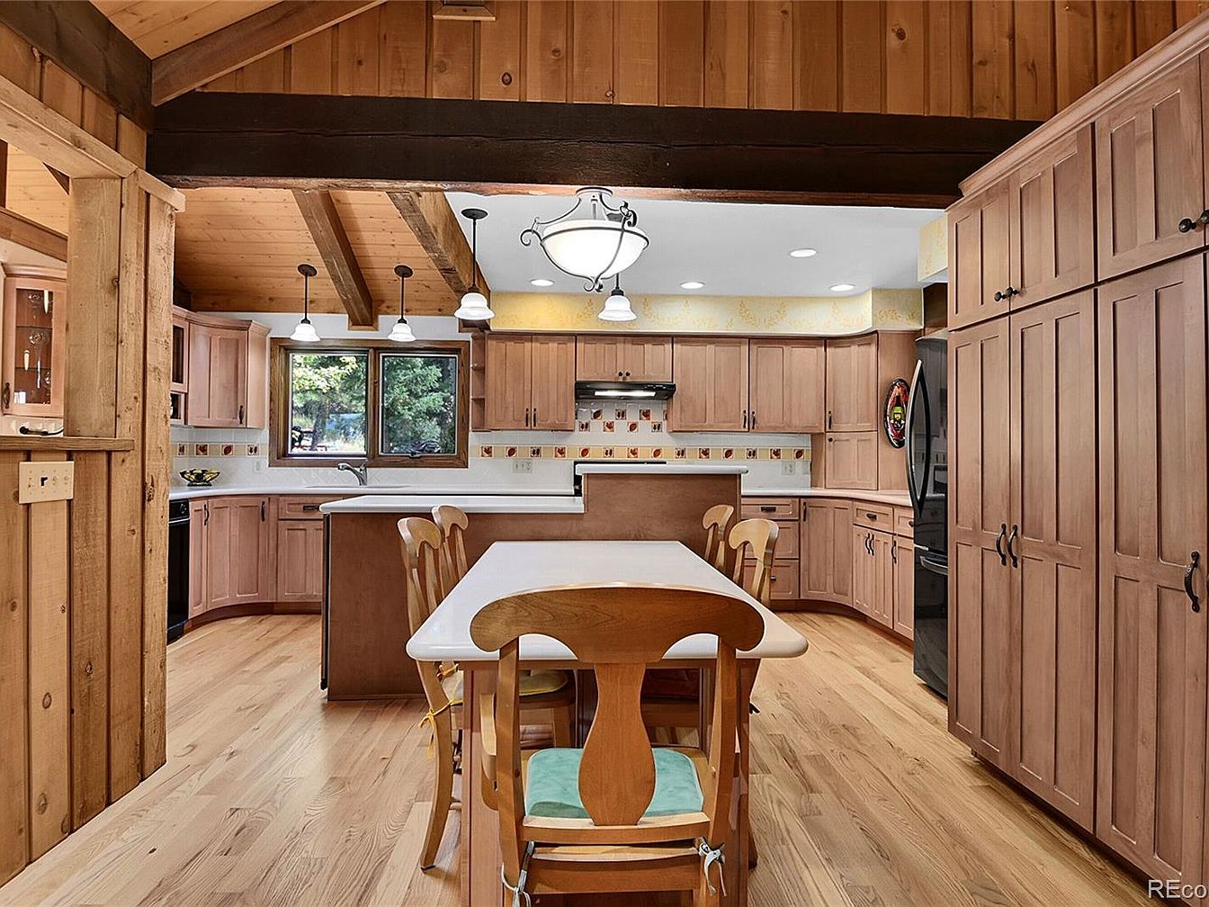Warm wood tones dominate this kitchen, with paneled walls, exposed ceiling beams, and matching cabinetry that create a cohesive rustic ambiance. The floors are lightly finished hardwood, which complements the cabinetry. A central island offers additional workspace and seating, while a rectangular dining table with wooden chairs sits in the foreground. Natural light pours in from a wide window above the sink, highlighting the simple backsplash featuring patterned tiles. Multiple pendant lights hang from the ceiling, adding both illumination and decorative interest. Large cabinets and drawers offer ample storage, while dark metal hardware contrasts subtly with the wood.