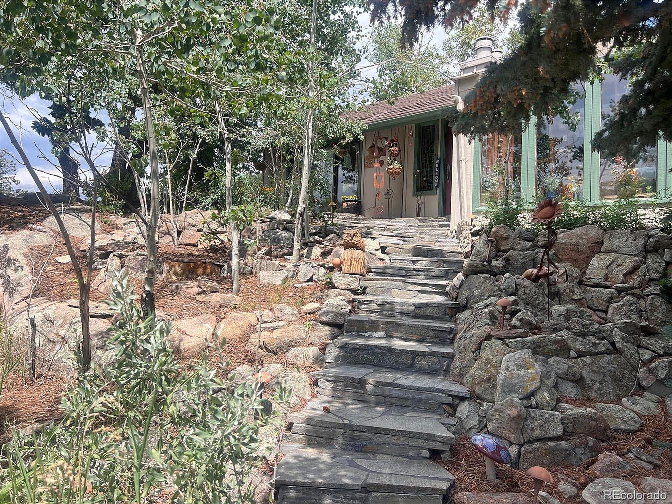 A stone walkway leads gently upward to the front entrance of the house, framed by rustic rock walls and natural landscaping. The path is flanked by clusters of small trees and native shrubs, offering filtered sunlight and a soft woodland feel. Decorative outdoor ornaments shaped like mushrooms are tucked among the rocks, adding a whimsical touch. The house features large windows with green trim, providing a seamless transition between indoors and out. Hanging plants and potted flowers by the doorway contribute warmth and character, blending with the earthy color palette and natural textures of this tranquil mountain setting.