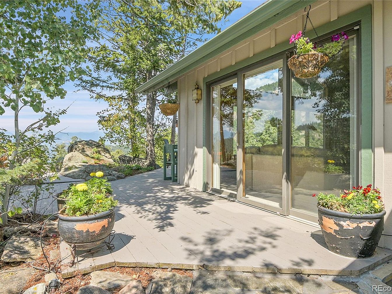 A decked patio area bordered by a muted wooden exterior with sage green trim around expansive sliding glass doors. Two large, weathered planters overflowing with vibrant yellow and red flowers frame the entrance, adding rustic charm. Hanging baskets with pink blooms suspend from the roofline, enhancing the natural aesthetic. The deck sits among boulders, surrounded by mature trees providing dappled shade and forest views. Reflections in the glass hint at mountain scenery beyond, while the peeling finish on the pots and subtle landscaping give the space an inviting, lived-in character. Overall, it feels peaceful and closely connected to nature.