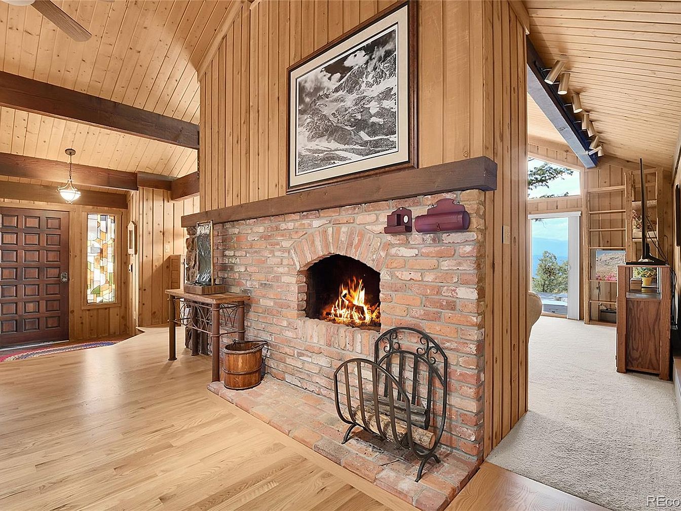Wood-paneled walls and vaulted ceilings with exposed beams create a warm and rustic ambiance. The entryway features a solid, square-patterned wooden front door, next to a stained-glass window that adds color and light. A large, brick wood-burning fireplace with a roaring fire is the focal point, accented by a dark wood mantle and black-and-white landscape artwork above. The foreground has honey-toned hardwood floors flowing into carpet toward the adjacent living area. A narrow wooden console with decorative items and a barrel accent sits by the fireplace, finishing off the cozy, inviting mountain home aesthetic.