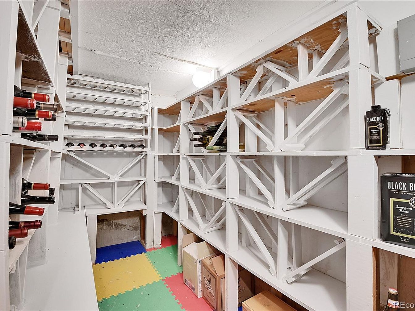 A narrow, well-lit storage room with white-painted custom shelving along both sides, designed to hold wine bottles and boxes. Bottles are neatly stored horizontally in individual rack slots, and the shelving features diagonal bracing, giving it a sturdy, utilitarian appearance. The floor is covered with colorful foam puzzle mats in yellow, red, green, and blue, adding a playful touch to the otherwise functional space. Exposed ceiling and visible light fixtures provide ample illumination. The overall aesthetic combines practicality with a bright, slightly rustic charm, maximizing storage capacity for wine and boxed beverages in a compact area.