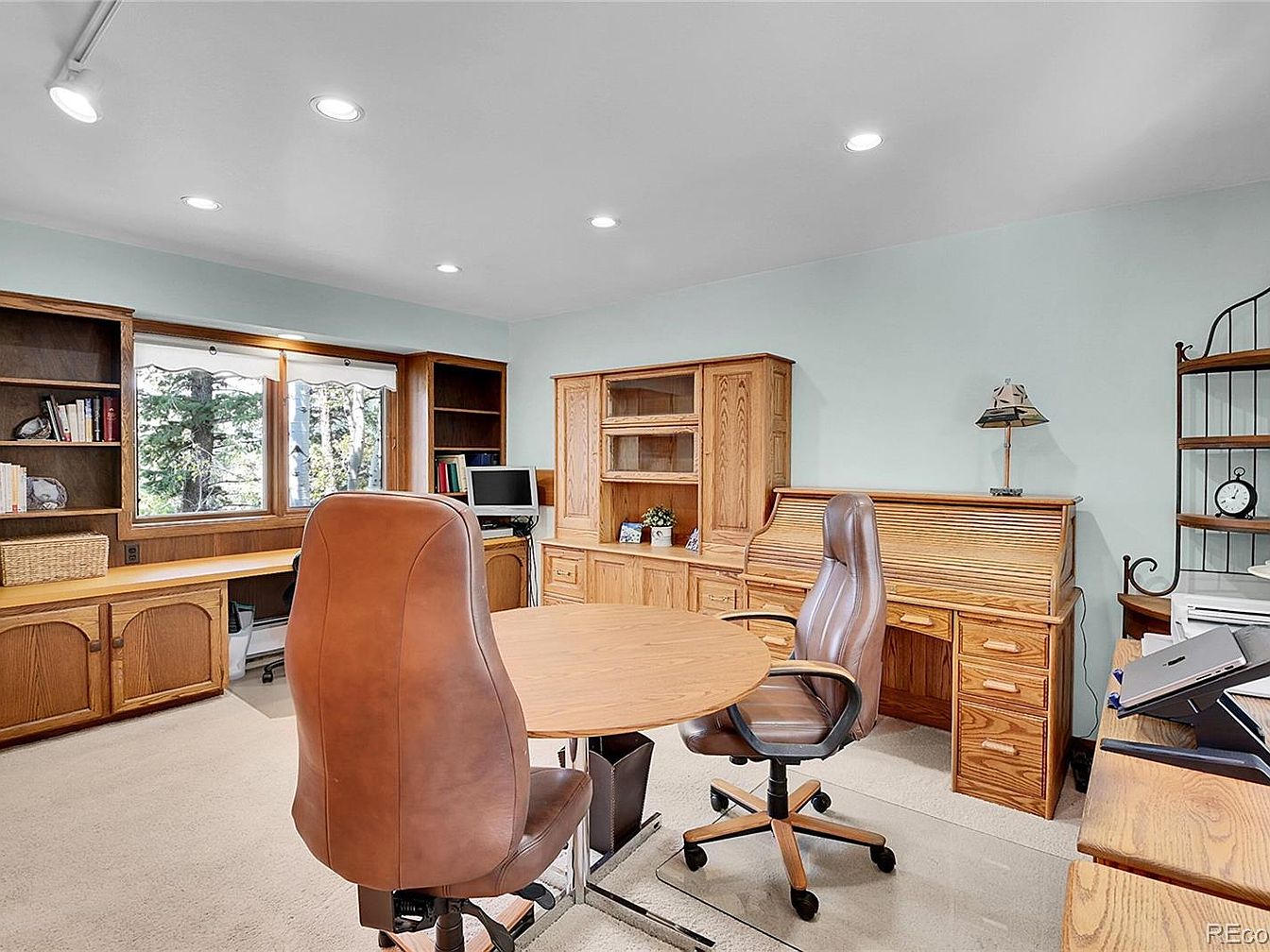 A spacious, well-lit home office features soft blue-green walls and plush beige carpeting. The room centers around a round wooden table and two brown leather swivel chairs, flanked by extensive custom-built oak cabinetry, bookshelves, and a roll-top desk, all with matching wood grain. Large windows on one side overlook lush greenery outdoors, bathing the space in natural light. Subtle recessed ceiling lights add brightness overhead. Additional elements include a small decorative lamp and a neatly organized open shelving unit, creating a warm, traditional atmosphere that emphasizes comfort, organization, and classic American craftsmanship. The room feels both inviting and highly functional.