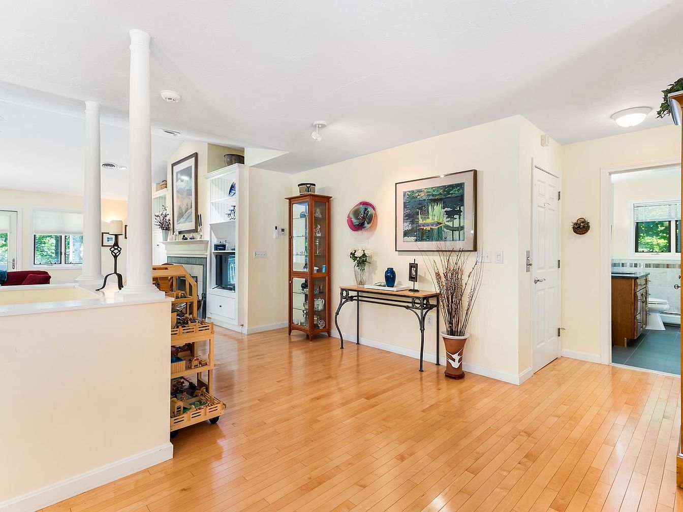 This entryway features a light and airy design, with warm wooden flooring enhancing the inviting atmosphere. Two white columns frame the space, guiding the eye towards various elements. The walls are painted a soft yellow, providing a cheerful backdrop for decorative items. A stylish console table displays an array of vases and a small floral arrangement, complemented by a large framed artwork. To the right, a glass-fronted cabinet showcases collectibles. Natural light filters through nearby windows, illuminating the space and highlighting the subtle architectural details like the simple moldings around doors and openings.
