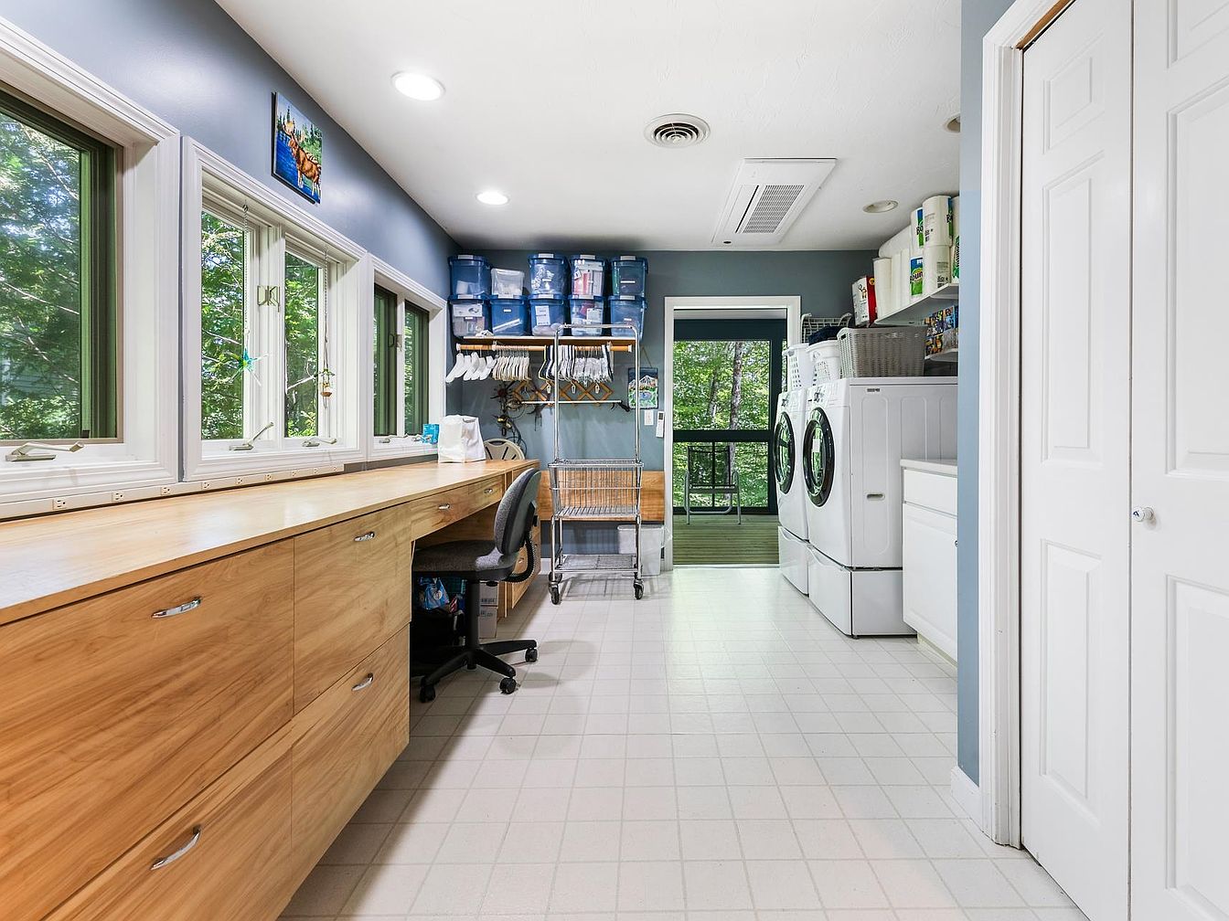 The laundry room features a spacious design with a light color palette, including pale blue walls that enhance the room’s brightness. A long wooden countertop runs along one side, providing ample workspace alongside modern appliances, including a stacked washer and dryer. Large windows flood the space with natural light, offering views of greenery outside. Organized storage solutions, such as clear plastic bins and a metal drying rack, add to the functionality. The tiled floor is practical and easy to clean, while the overall aesthetic combines efficiency with a touch of warmth from the wood finish.