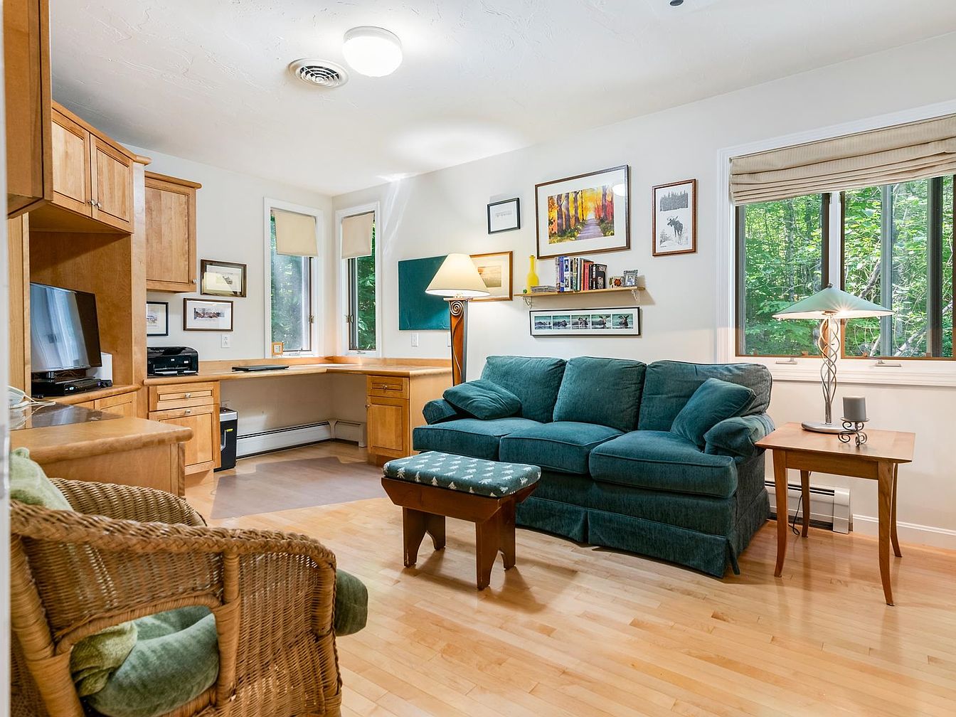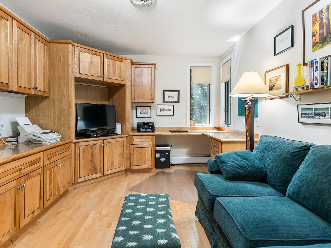 This home office features a cozy layout with a blend of functionality and comfort. Vibrant teal upholstery on the sofa invites relaxation, complemented by a matching ottoman. The warm honey-toned wooden cabinetry houses essential equipment, alongside a discreet printer. Natural light floods through large windows, framed by beige shades, enhancing the serene ambiance. A wooden desk adjacent to the window provides an ideal workspace, lined with framed artwork that integrates nature themes. Subtle architectural details, like the soft light fixture and warm wooden flooring, create an inviting yet productive atmosphere, perfect for work or quiet reflection.