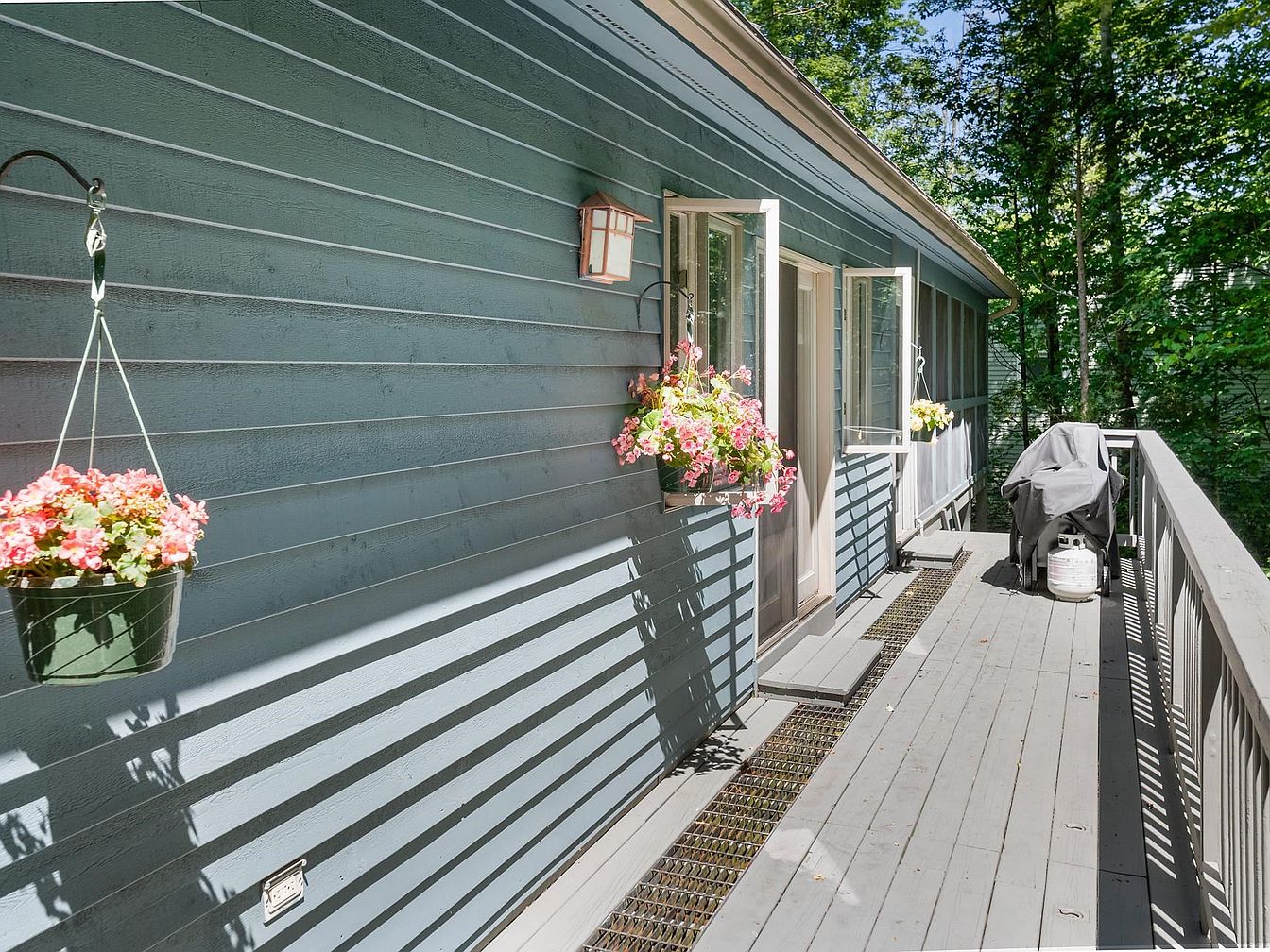 A spacious outdoor deck extends from the house, featuring a wooden floor painted in a light gray tone. The walls are clad in a muted blue siding, adding a serene backdrop. Soft pink and white flower pots hang from the railing, introducing vibrant color and a touch of nature. Sunlight casts gentle shadows, enhancing the ambiance. Two windows are open, allowing fresh air to circulate, while a covered grill sits neatly to one side, suggesting a space for outdoor cooking. Lush greenery surrounds the area, contributing to a peaceful, inviting atmosphere perfect for leisure.
