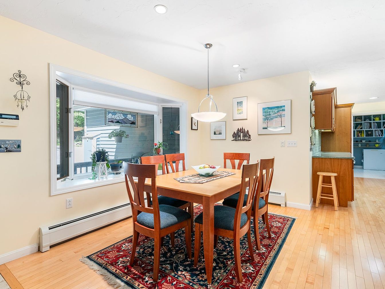 This dining area features a warm, inviting vibe with soft yellow walls that complement the light maple flooring. A wooden table occupies the center, surrounded by four chairs with navy blue upholstery, creating a cozy atmosphere for meals. Above the table hangs a modern pendant light, adding a contemporary touch. A vibrant red area rug anchors the space and enhances the overall aesthetic. Large windows bring in natural light and provide a view of the outdoors, framed by simple treatments that keep the focus on the scenery. Decor elements include framed artwork, lending character to the room.