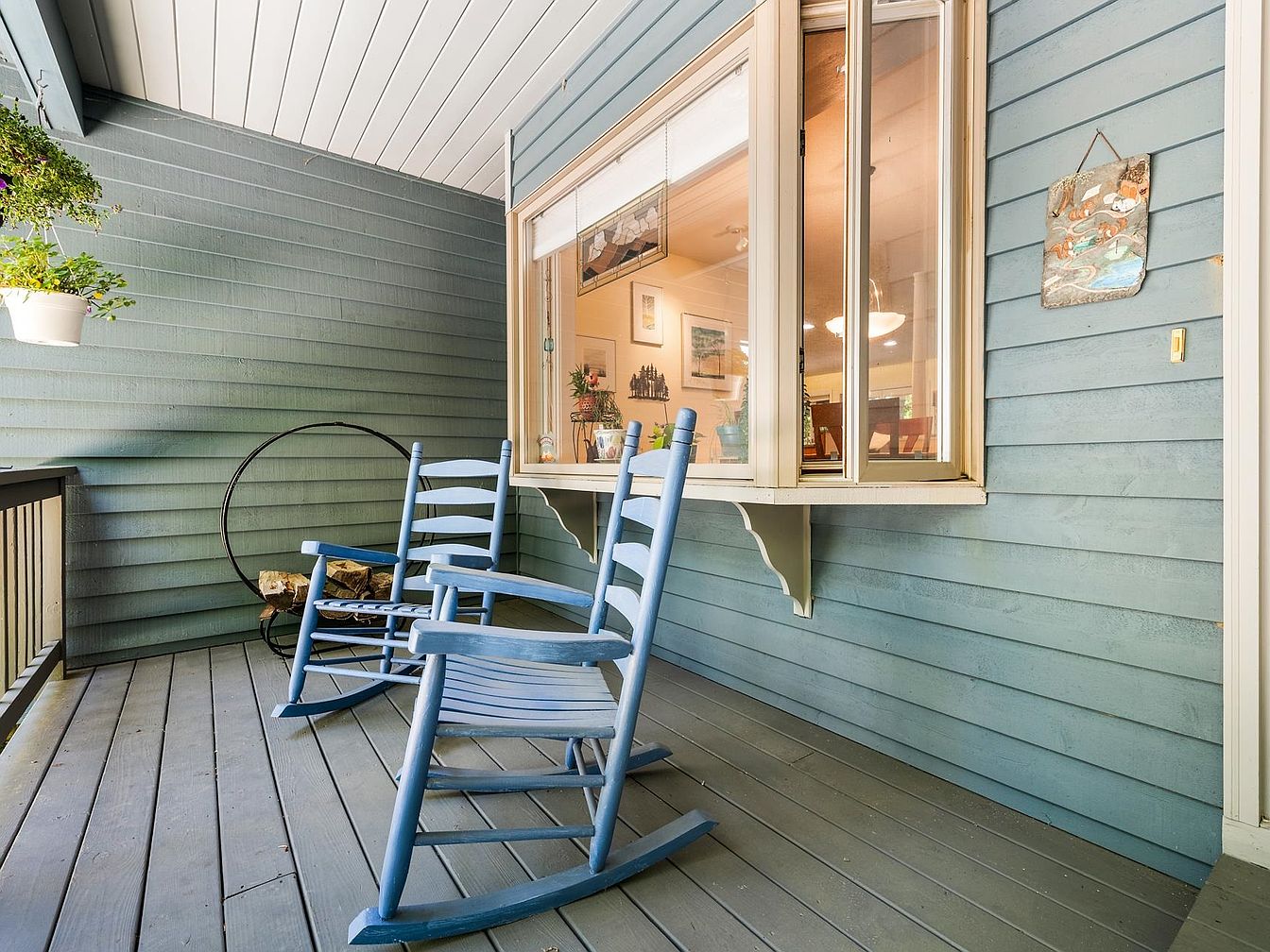 This inviting front porch features a tranquil palette of soft blue hues, harmonizing with the painted wooden siding. Two classic rocking chairs emphasize comfort, facing the open window that offers an indoor-outdoor feel. A thin railing outlines the porch, adding an element of safety without obstructing views. The wood floors, stained in a slightly darker gray, bring warmth before leading the eye to a circular seating feature in the background. Hanging planters introduce a touch of greenery, enhancing the peaceful atmosphere. Decorative items, including wall art, add character and charm to this welcoming space.