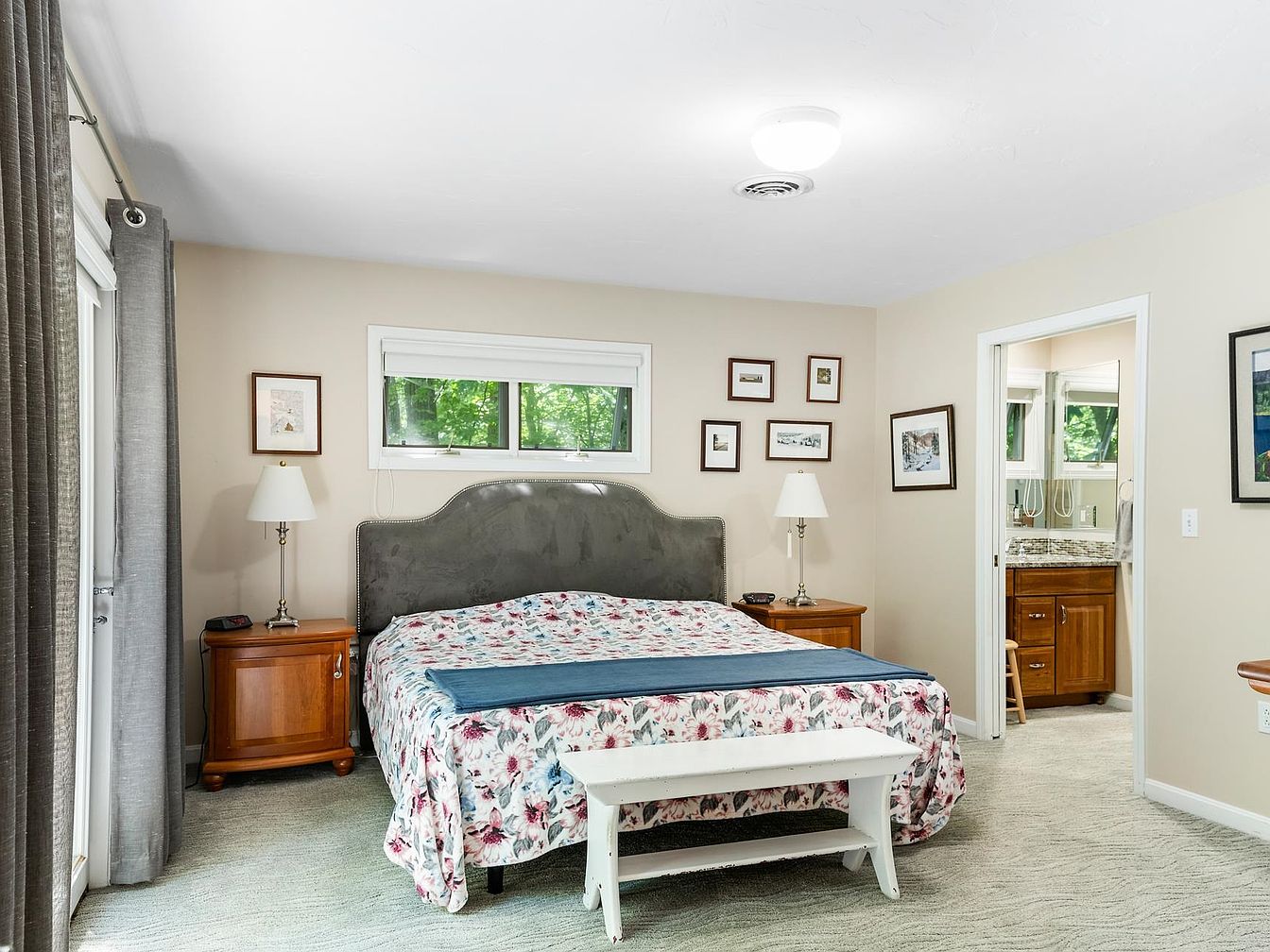 A serene bedroom featuring a plush gray upholstered headboard and a floral-patterned bedspread with shades of pink and blue. Neutral beige walls complement the soft, light gray carpet, enhancing the cozy atmosphere. Two bedside tables offer warm wooden finishes, each adorned with elegant white lamps for soft lighting. Framed art hangs on the walls, adding personality and charm. A large, double window allows natural light to flow in, offering views of greenery outside, while sheer curtains maintain privacy. An open doorway leads to a connecting bathroom, seamlessly integrating functionality into this inviting space.