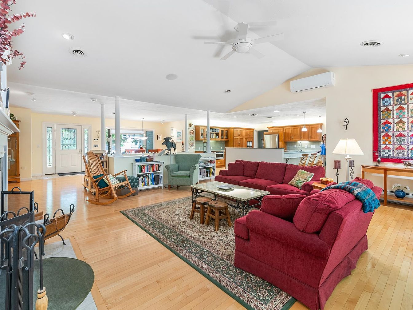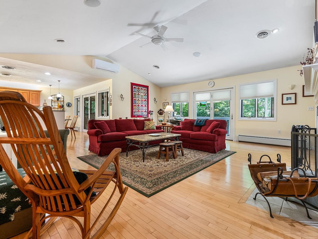 This spacious living room features a bright and inviting atmosphere, characterized by warm wooden flooring and light-colored walls that enhance the natural light. A large, rich burgundy sectional sofa dominates the seating arrangement, complemented by a decorative area rug with intricate patterns. Across from the sofa, a charming coffee table provides a focal point. The ceilings are vaulted, adding height, and multiple windows offer views of green outdoor spaces. A sleek ceiling fan circulates air while a small fireplace in one corner adds warmth. Accents like wall art and tasteful decor complete the cozy, comfortable setting.