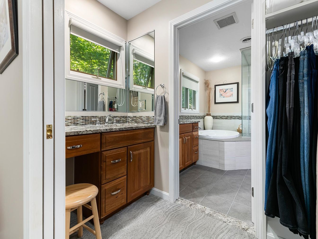 A spacious bathroom features a blend of modern and traditional design elements. The warm wood cabinetry complements the cool-tone granite countertop, creating an inviting atmosphere. Large mirrors above the sleek vanity reflect natural light, amplifying the room’s openness. On the right, a neatly organized closet displays hanging clothes, while gray tile flooring adds a contemporary touch. A soothing color palette of beige and light hues enhances the tranquility. A separate area showcases a stylish bathtub, accented by a tasteful piece of artwork, with vertical windows providing a view of greenery outside, fostering a peaceful retreat.