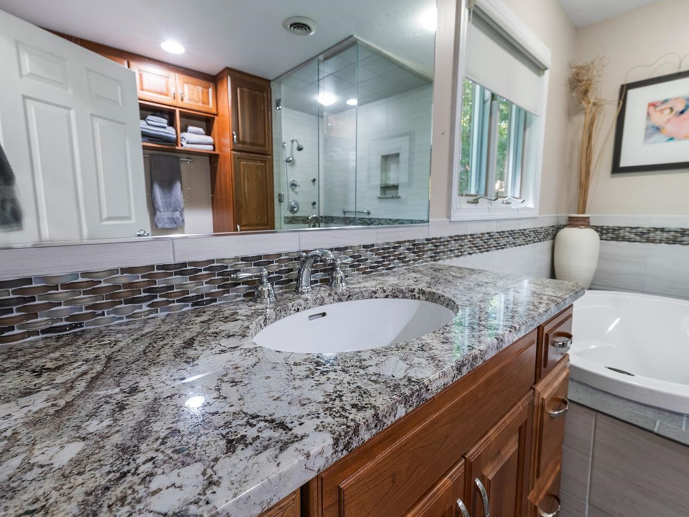 The bathroom features a spacious vanity with a striking granite countertop, showcasing a blend of cream, taupe, and deep brown tones. Underneath, rich wooden cabinetry provides ample storage. A sleek, modern sink sits prominently, flanked by polished chrome faucets. The wall behind the sink is adorned with a mosaic tile backsplash, adding texture and contrast. Natural light pours in through a window, complemented by soft, neutral wall colors. Opposite the vanity, a comfortable soaking tub is partially visible. Decorative elements include a tall vase with dried plants, enhancing the serene and warm ambiance of the space.