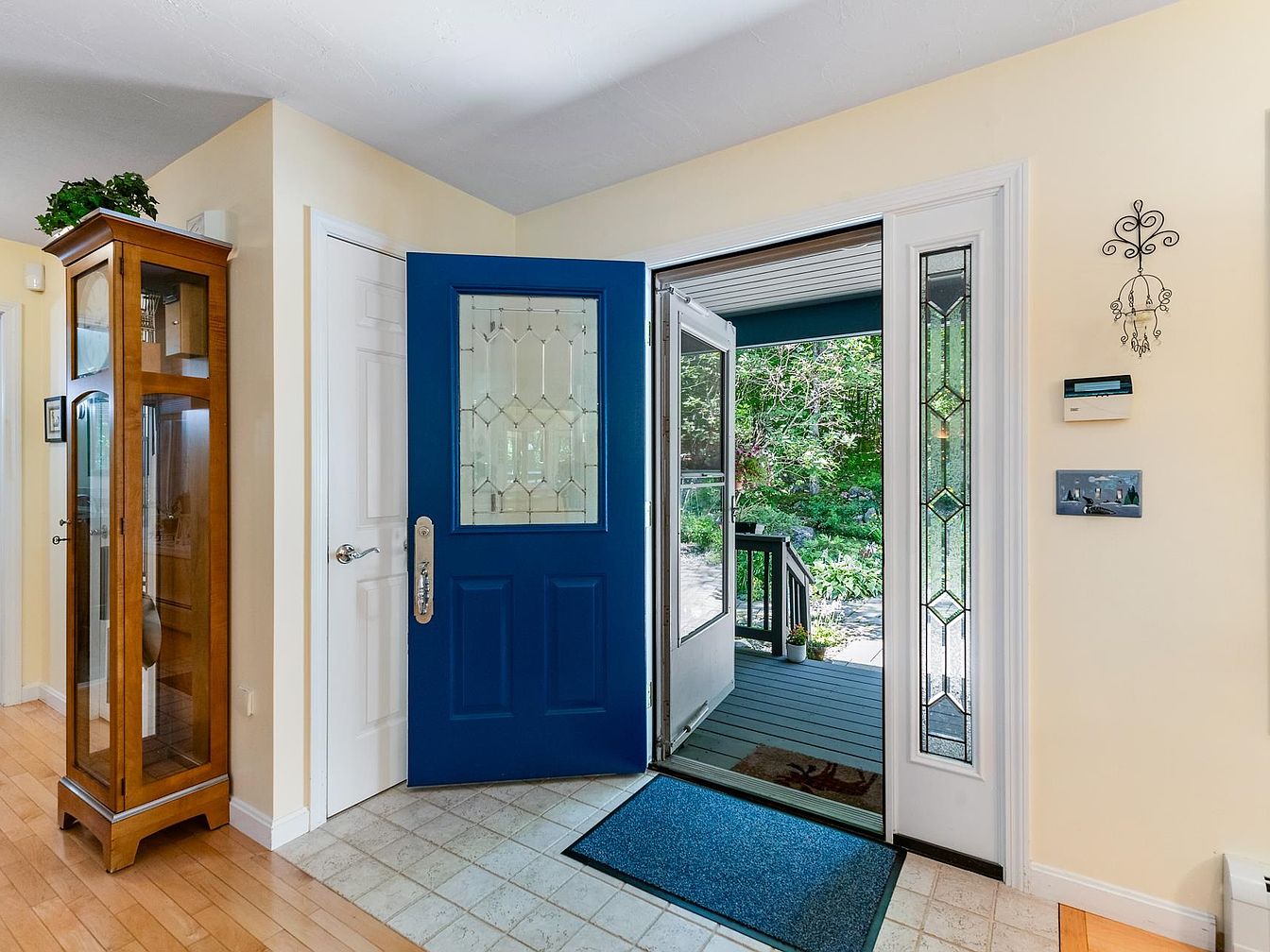 The entryway features a striking blue front door with glass panels, inviting natural light while enhancing curb appeal. Adjacent to it stands a tall wooden cabinet showcasing decorative items. The walls are painted a soft, warm yellow, offering a welcoming atmosphere. Natural light floods through the glass door, highlighting the beige tiled flooring that transitions to a hardwood entrance. A welcome mat lies before the door, with a small area rug adding texture. To the right, a discreet light fixture complements the space. Various accents, including a small wall decor, provide a personal touch, enhancing the inviting feel.