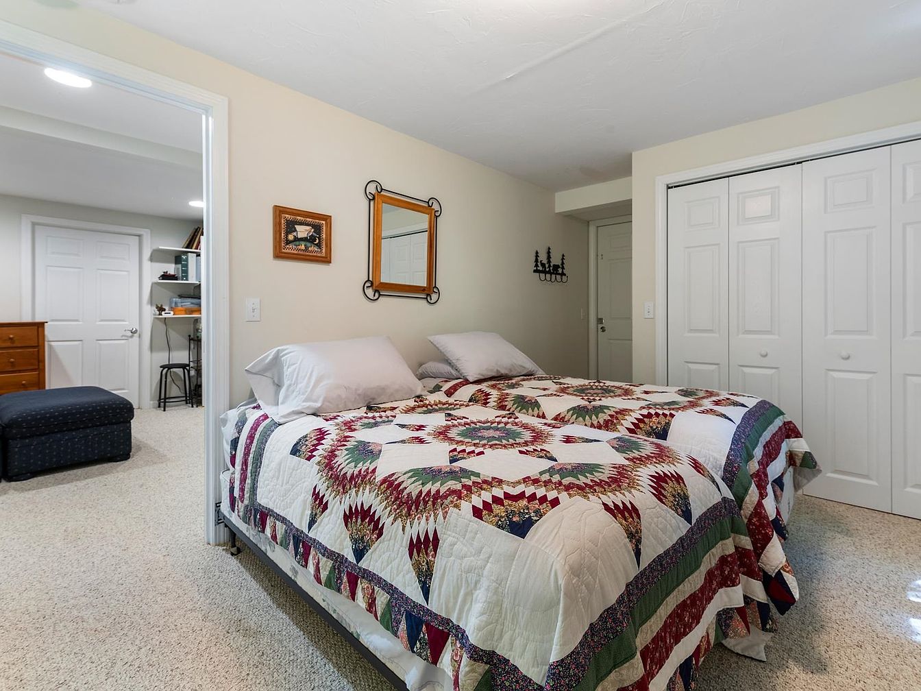 A cozy bedroom featuring two twin beds dressed in a colorful, patterned quilt with rich reds, greens, and whites. The walls are painted a soft beige, enhancing the warm and inviting ambiance. A round mirror with an ornate black frame hangs above the beds, reflecting light and space. To the side, a dark blue ottoman adds a touch of comfort, paired with a wooden dresser that offers storage. A closet with double doors is situated nearby, while a wall-mounted candle holder adds a subtle decorative element. The room showcases plush carpeting, creating a soft underfoot feel, perfect for relaxation.