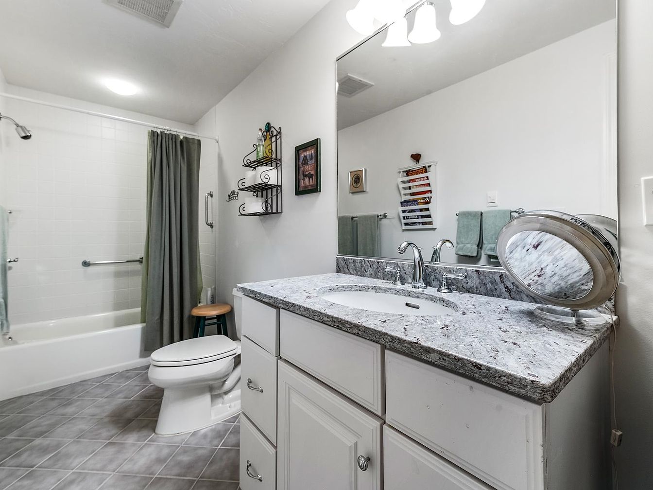 The bathroom features a clean, minimalist design characterized by a light color palette of white and soft gray. A spacious white bathtub is framed by a green fabric shower curtain, adding a touch of warmth. The granite countertop with varied hues showcases attractive veining, complemented by modern chrome faucets. Underneath, white cabinetry provides storage, smoothly integrated with silver handles. A round mirror reflects light, brightening the space, while a wall-mounted rack holds toiletries and towels, enhancing functionality. Textures are varied, with tiled flooring offering a subtle pattern that contrasts with the smooth fixtures.