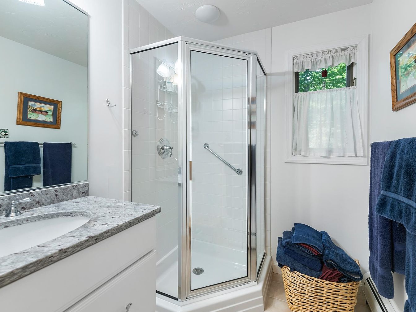 The bathroom features a compact layout with clean lines and a bright aesthetic. A glass-enclosed shower stands in the corner, showcasing white tiled walls. A sleek mirror above a granite countertop reflects the light, enhancing the space’s brightness. Below the counter, white cabinetry offers storage, complemented by a woven basket filled with neatly stacked towels in varying shades of blue. A pair of navy towels hang on a silver rack, balanced by a small framed painting on the wall, adding a touch of personality. Natural light filters through a small window with white curtains, bringing a refreshing ambiance.