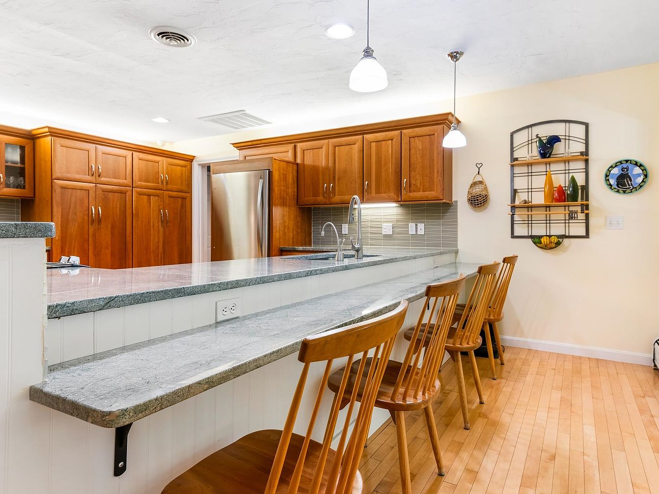 This kitchen features a spacious countertop made of polished granite, contrasting beautifully with warm wooden cabinetry. The cabinets have raised panel doors and a rich, cherry finish, accentuating the classic aesthetic. A stainless steel refrigerator and sleek sink are visible, blending functionality with style. Four wooden stools with a simple, spindle design are positioned on one side of the countertop, creating a casual dining space. Above, pendant lights provide ambient lighting, and a decorative wall rack displays colorful ceramic items, adding a personal touch. The overall color scheme is inviting, combining soft neutral tones with warm wood.