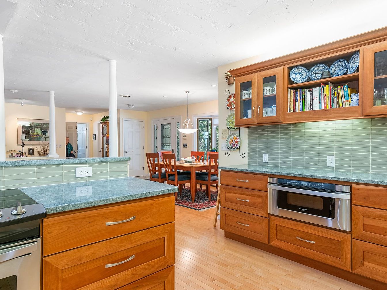A spacious kitchen area featuring a streamlined design with light wood cabinetry and a unique green granite countertop. The cabinets display dishware and cookbooks, enhancing the kitchen’s functionality and warmth. A pair of white columns delineates the kitchen from the dining area, promoting an open-concept feel. The light fixture above the table provides illumination, complementing the soft beige walls. Warm wood flooring adds a cozy touch, while the glossy tiles on the backsplash reflect subtle light. Nearby, a dining set with wooden chairs faces a glass door leading to a patio, unifying indoor and outdoor spaces.