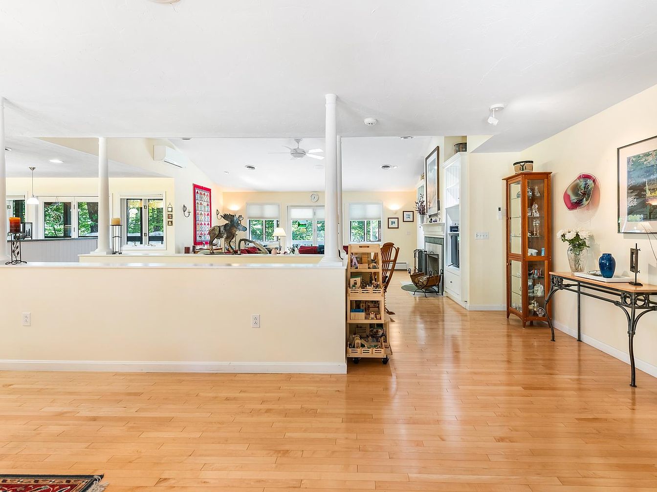 A spacious living room seamlessly integrates with adjacent areas, featuring light hardwood flooring and pale yellow walls that enhance brightness. Natural light floods through large windows, adorned with simple white treatments. A decorative red accent wall showcases a collection of framed photographs, adding a personal touch. Elegant furniture includes a combination of a wooden dining chair and a glass-front cabinet displaying an assortment of fine collectibles. An inviting beige sofa is visible in the background, complemented by subtle artwork on the walls. Decorative elements such as candles and a moose sculpture provide warmth and character to the room.