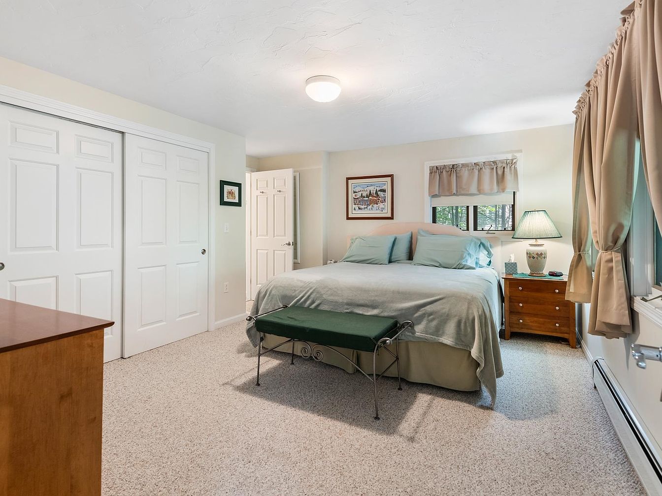 This tranquil bedroom showcases a soft, calming palette of beige and light teal. The queen-sized bed, adorned with a mint green coverlet and matching pillows, serves as the room’s focal point. Flanking the bed, a pair of windows dressed with light beige curtains allow natural light to filter in, highlighting the serene atmosphere. A wooden nightstand holds a vintage lamp, while artwork on the wall adds a personal touch. Opposite the bed, dual closets provide ample storage. The plush, beige carpet enhances comfort, creating an inviting space perfect for relaxation or restful nights.