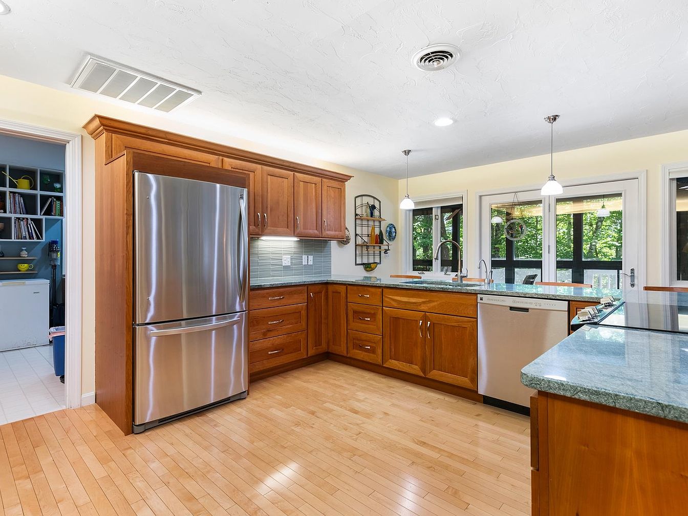 This kitchen features warm wood cabinetry with a rich finish, complementing the smooth, light-colored granite countertops. A stainless steel refrigerator stands prominently against the cabinetry, reflecting the ambient light. Natural wood flooring adds warmth, enhancing the cozy atmosphere. Pendant lighting hangs over the central island, illuminating the space effectively. Large windows frame a view of the surrounding greenery, inviting the outdoors in. The layout is open and functional, with easy access to storage, cooking surfaces, and the sink. Decorative items on the walls create a personalized touch, balancing modern efficiency with homey charm.