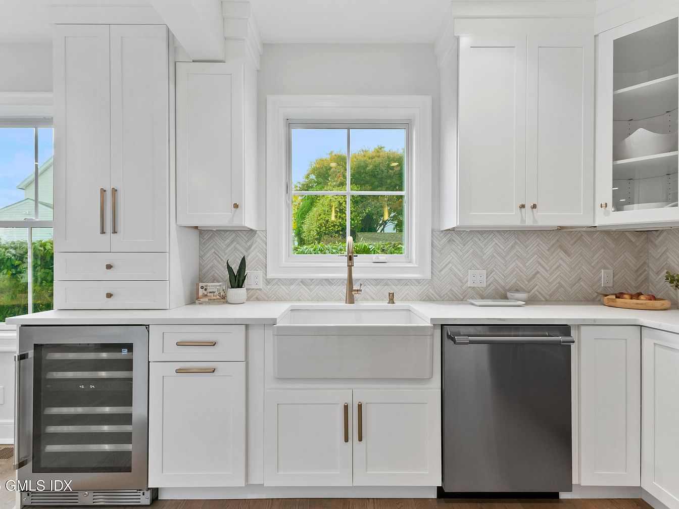 This kitchen features a bright, modern design characterized by crisp white cabinetry and a spacious layout. The centerpiece is a farmhouse sink, complemented by sleek gold hardware and a contemporary faucet. A herringbone patterned backsplash adds subtle texture, enhancing the aesthetic appeal. To the left, built-in cabinetry offers ample storage, while a wine cooler sits beneath the counter on the far left. Natural light floods the space through a large window overlooking green foliage, creating a serene atmosphere. The gray stainless steel dishwasher harmonizes with the neutral color palette, providing a clean, elegant finish to the overall design.