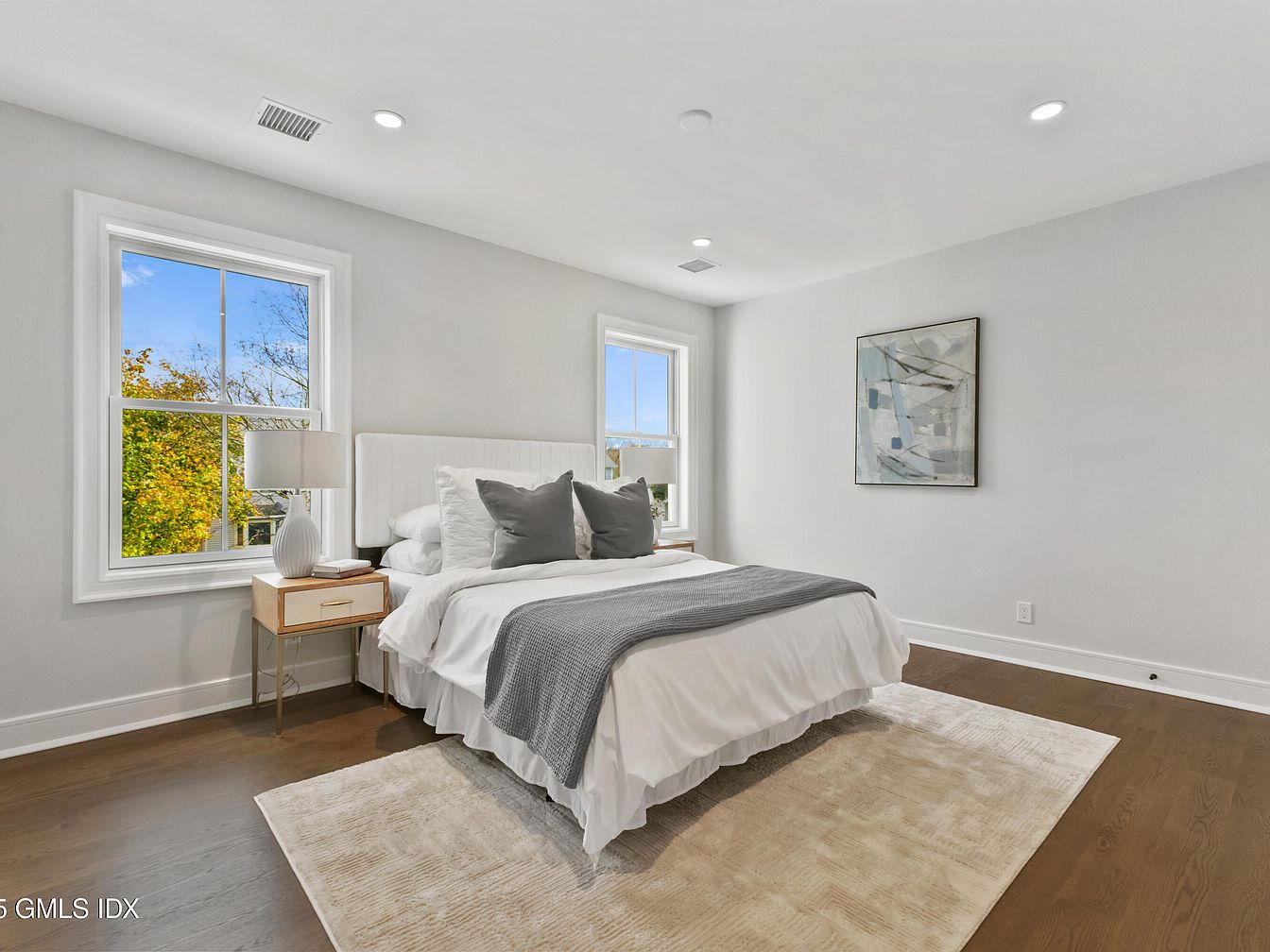 A minimalistic bedroom featuring a plush, white bed dressed in crisp linens with accent pillows. The color palette is serene, combining soft whites, grays, and a warm brown wooden floor. Beside the bed sits a sleek nightstand with a stylish lamp, adding a touch of elegance. Natural light floods the space through two large windows adorned with white trim, allowing glimpses of vibrant foliage outside. The walls are painted a light gray, enhancing the airy feel. A subtle area rug anchors the room, while a contemporary piece of art hangs, providing a focal point without overwhelming the tranquil ambiance.