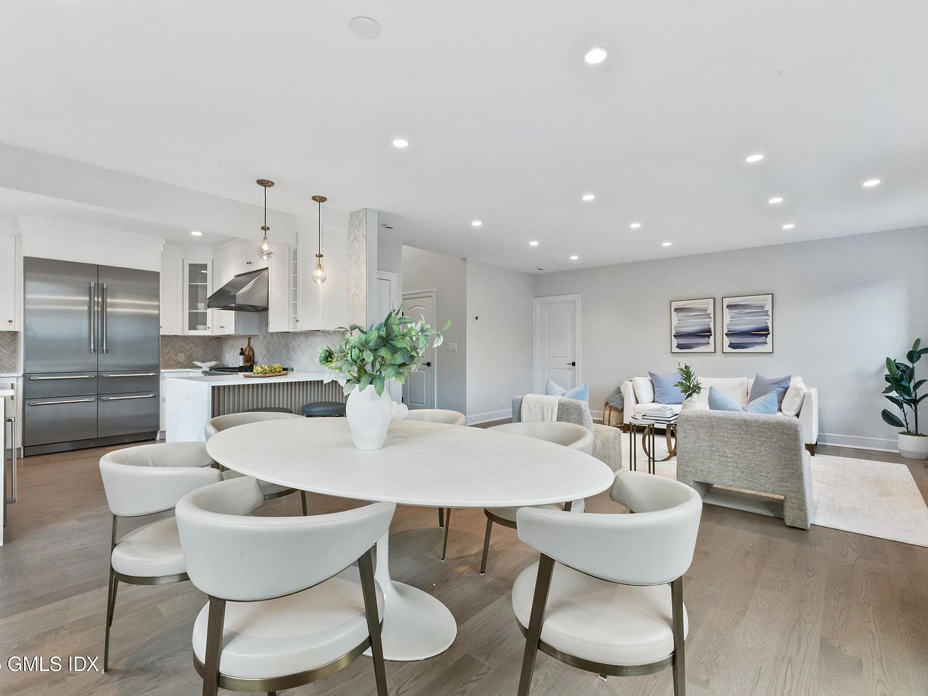 This image showcases a modern open-concept dining and living area. A sleek, round dining table is surrounded by five stylish white chairs, accented with soft gold legs. In the background, a contemporary kitchen features stainless steel appliances, including a large refrigerator and a range hood, with minimalist white cabinetry and textured backsplash. The rich, warm wood flooring complements the light gray walls. Natural light floods the space, highlighting the subtle art pieces on the wall that incorporate shades of blue and beige. A cozy seating area includes light-colored sofas adorned with plush cushions, enhancing the inviting ambiance.