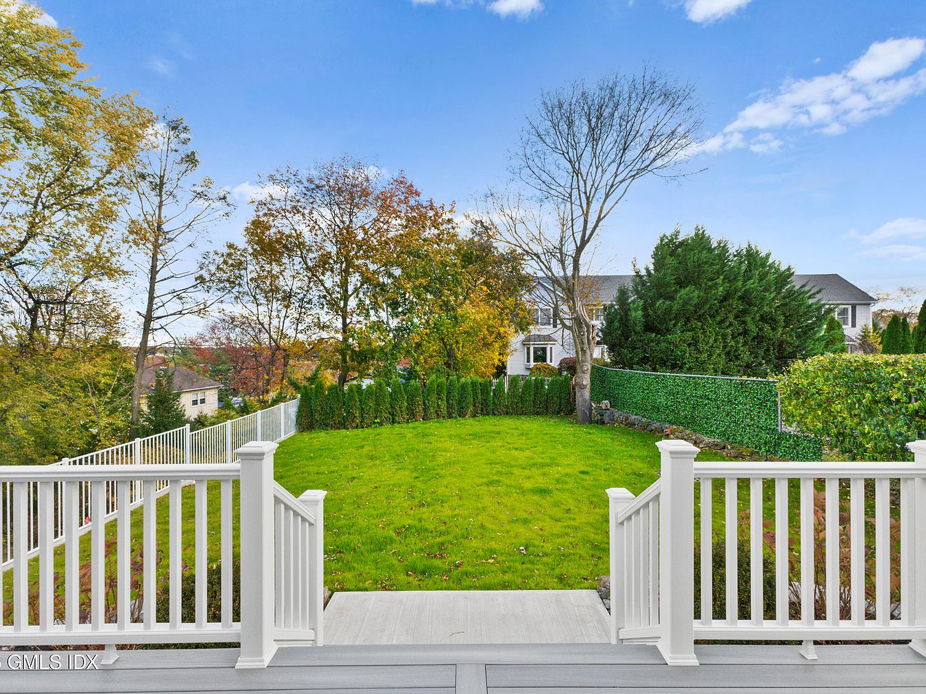 A spacious backyard featuring a lush green lawn surrounded by vibrant trees in autumn hues of orange, yellow, and red. White fencing borders the yard, creating a clean and serene look, while a stone wall adds rustic charm. The view showcases a well-maintained landscape, with neatly trimmed hedges and tall shrubs providing privacy. Directly in front, a wooden deck provides an inviting space for outdoor gatherings, with elegant white railings enhancing the aesthetic. The sky above is bright with a few scattered clouds, contributing to the overall tranquil and picturesque setting.