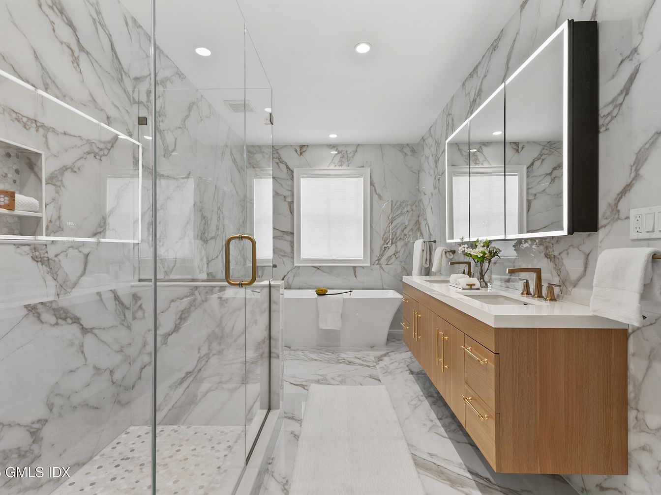 This elegant bathroom features a contemporary design characterized by luxurious marble walls and flooring, displaying bold veining patterns in shades of white and gray. The spacious layout includes a glass-enclosed shower with a gold handle, providing a chic yet practical element. A floating vanity made of warm wood houses sleek golden hardware, complementing the overall sophistication. Above the vanity, a mirrored cabinet with integrated lighting adds functional elegance. Natural light enters through a window, further enhancing the bright, airy atmosphere. Decorative touches include neatly arranged towels and a small vase with flowers, contributing to a serene retreat.