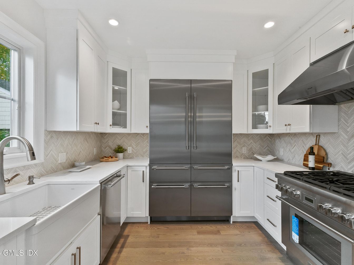 This kitchen showcases a modern layout with clean lines and a blend of functionality and style. The streamlined white cabinetry offers an elegant contrast to the warm wooden flooring, enhancing the space’s brightness. A large, stainless steel refrigerator stands prominently against a chic herringbone-patterned backsplash, while a sleek countertop extends elegantly. The kitchen features a professional-grade gas range and a deep farmhouse sink with a stylish faucet. Natural light streams in through large windows, highlighting decorative accents like a wooden cutting board and minimalist decor, creating an inviting atmosphere perfect for culinary creativity.