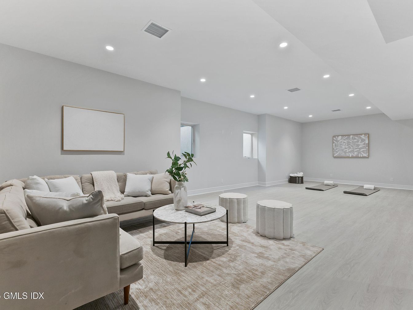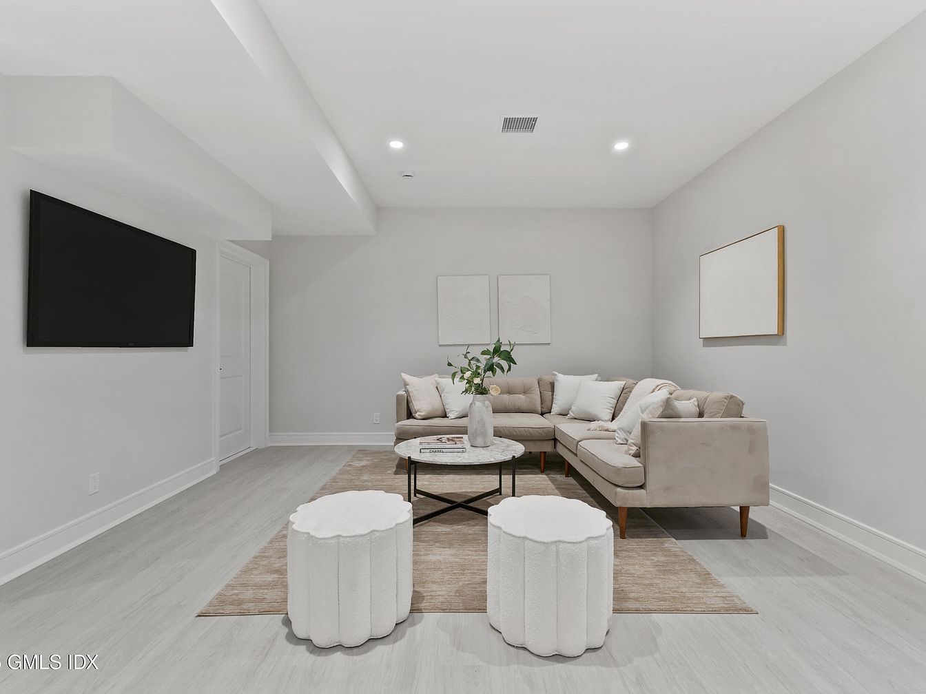 This living room features a sleek, modern design with a light color palette dominated by soft gray walls. A plush sectional couch in a light beige occupies one corner, adorned with white and cream throw pillows, inviting relaxation. A round coffee table with a marble top and black metal base centers the space, complemented by two white, textured poufs on either side. A large wall-mounted television sits across from the seating area, enhancing functionality. The room is illuminated by recessed lighting, creating a warm atmosphere. Minimalist artwork hangs on the walls, adding an elegant touch to the contemporary aesthetic.