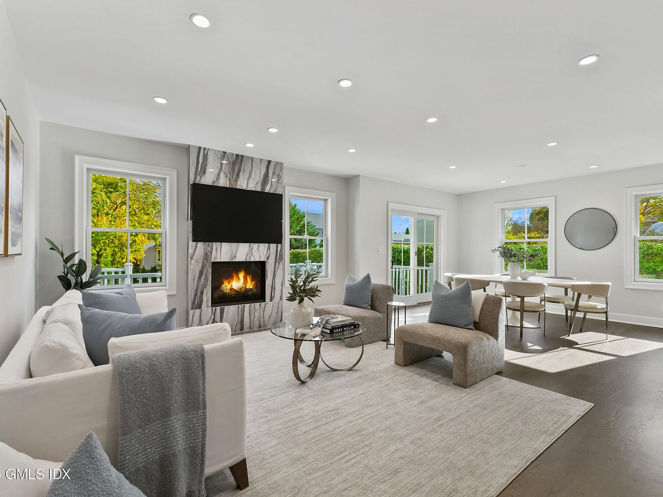 This modern living room features a bright and airy atmosphere with large windows allowing natural light to flood the space. A sleek marble fireplace serves as a stunning focal point, complemented by a mounted flat-screen TV above. The neutral color palette, consisting of soft whites and grays, is accentuated by cozy throw pillows. A plush area rug anchors the room, while a contemporary glass coffee table reflects the light. To the side, a stylish dining area showcases elegant chairs around a minimalist table, enhancing the overall chic and inviting vibe of the space.