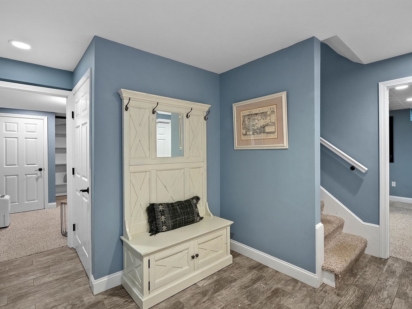 The entryway features a calming blue wall with contrasting white trim, creating a fresh and inviting atmosphere. A white, wooden bench with a storage compartment sits against the wall, adorned with a decorative black and white pillow. Above, hooks for hanging coats complement a mirrored panel, enhancing light and space. Light-colored laminate flooring extends throughout, blending seamlessly with plush beige carpeting leading to the staircase. The steps are accentuated by a simple white railing. A framed vintage map on the wall adds character, while the adjacent doors lead to additional spaces, enhancing functionality.