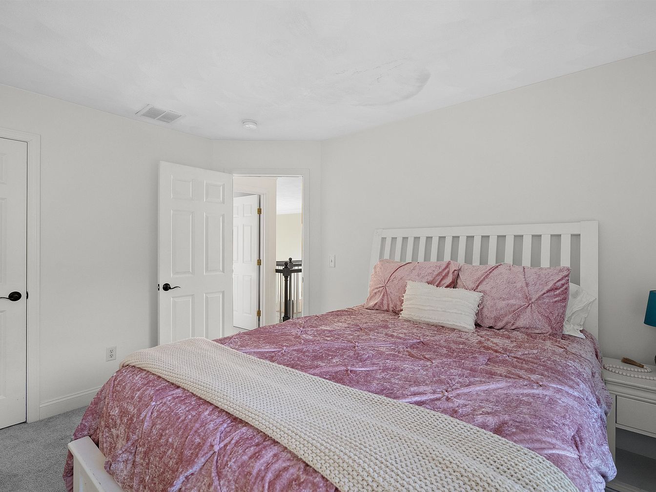 This cozy bedroom features a large bed with a blush pink velvet duvet, complete with matching pillows and a textured white throw pillow for added comfort. The bed is framed by a white wooden headboard, creating a clean and fresh aesthetic. Walls are painted in a soft neutral hue, enhancing the room’s bright and airy feel. Carpeted flooring contributes to the cozy atmosphere. A bedside table in white complements the bed design, with a striking teal lamp adding a pop of color. Double doors lead to additional rooms, showcasing practical layout and inviting light into the space.