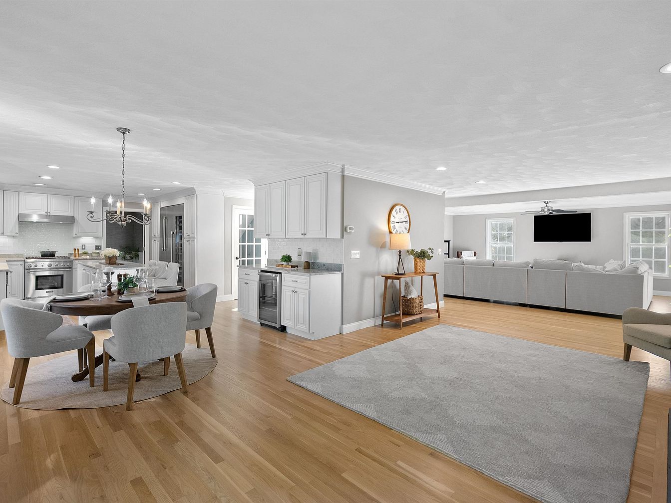 This image showcases an open-concept kitchen and dining area seamlessly blending with the living space. The room features light-colored wooden flooring that adds warmth. Soft gray walls pair beautifully with white cabinetry and quartz countertops in the kitchen. A round wooden dining table is surrounded by plush, light gray chairs, creating an inviting setting. A contemporary chandelier hangs above, enhancing the elegant vibe. In the living area, a large gray sectional sofa is accented by bright, natural light from ample windows. Decorative elements include a stylish clock and greenery, adding life and charm to the space.