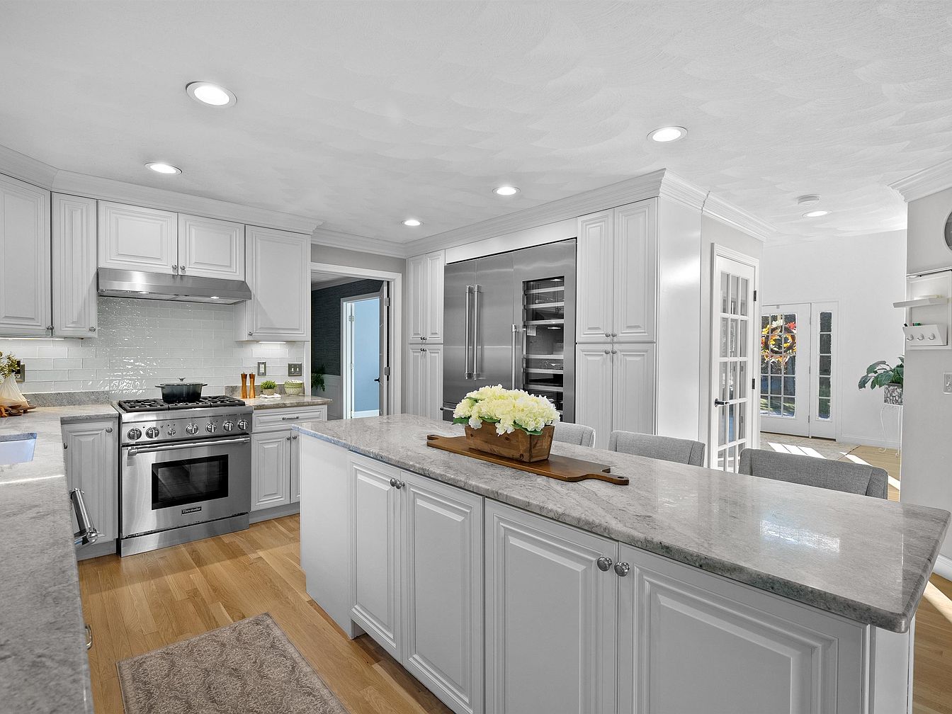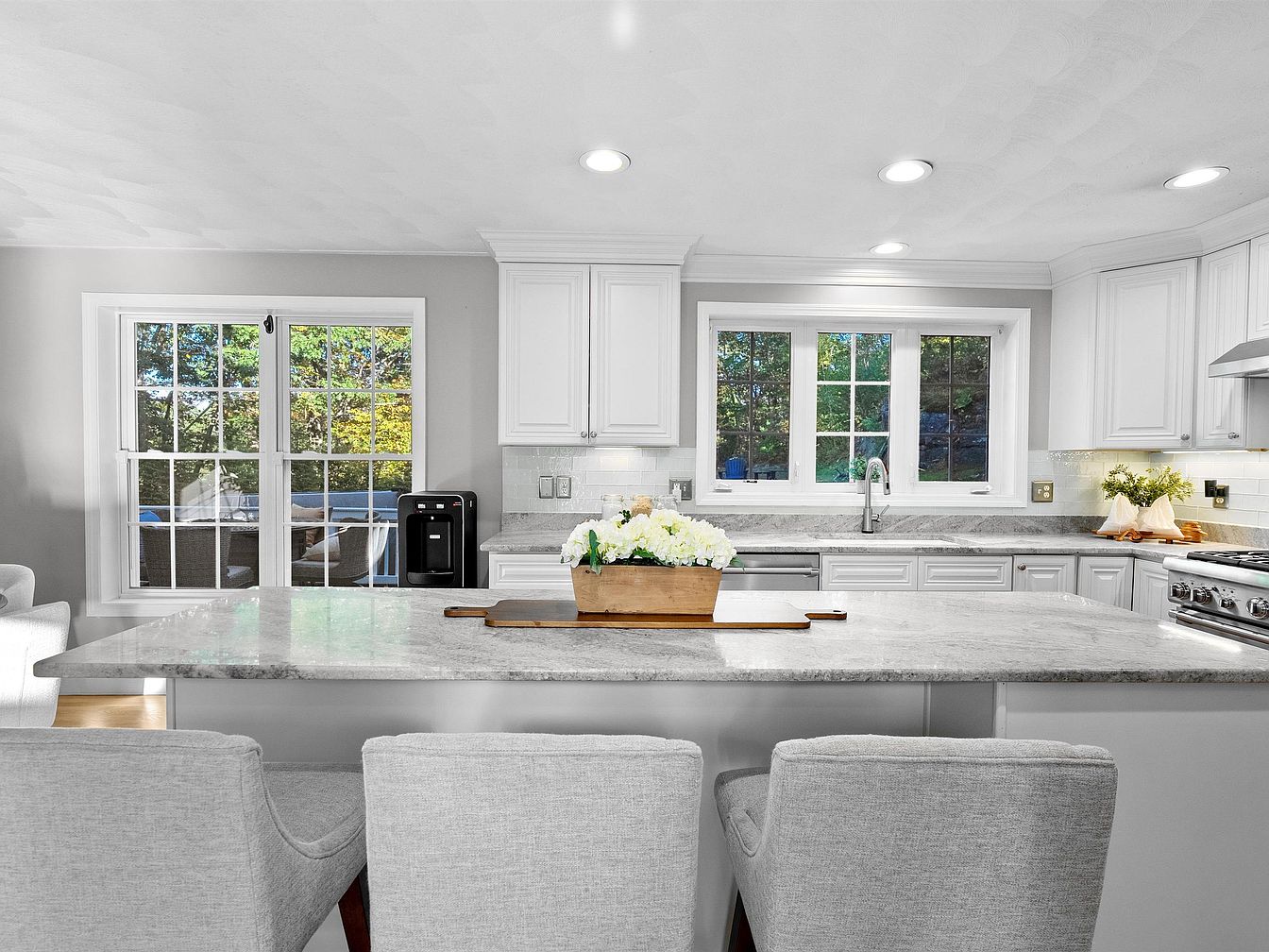 The kitchen features an open layout with sleek white cabinetry, providing a bright and airy feel. A large central island, topped with elegant gray granite, serves as a functional cooking and dining space. Stainless steel appliances, including a professional-grade gas stove, enhance the modern look. Subtle recessed lighting highlights the polished surfaces. The walls are adorned with a classic subway tile backsplash, reflecting light and adding a touch of texture. A cozy seating area is positioned nearby, with plush, neutral-colored chairs, creating a warm gathering spot. Large windows invite natural light and connect the space to the garden outside.