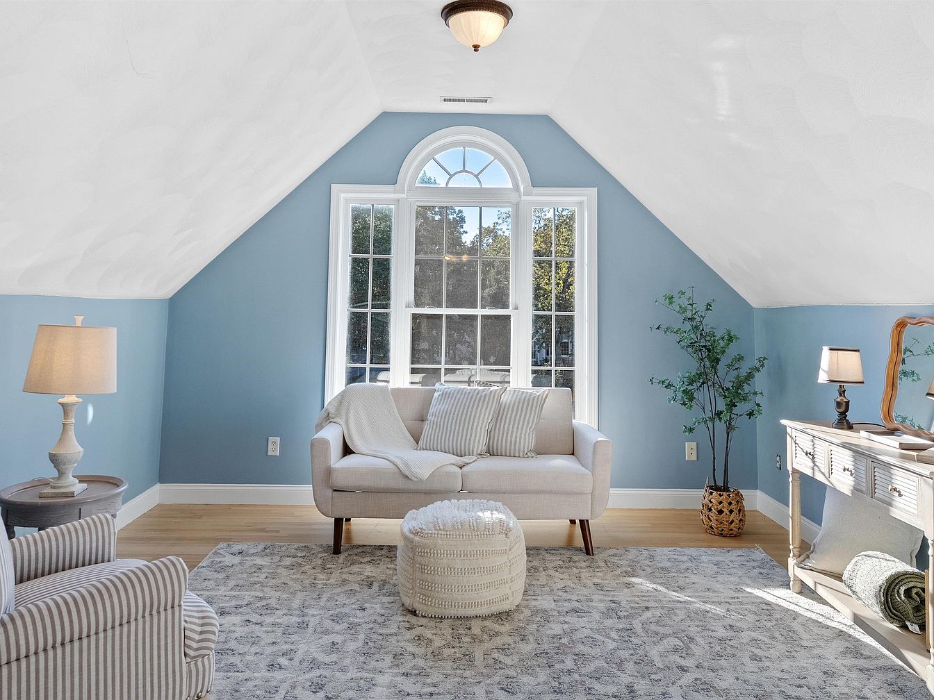 This spacious bedroom features a calming blue color palette with vaulted ceilings, creating an airy atmosphere. A wrought-iron bed with plush beige bedding serves as the focal point, complemented by matching pillows. Natural light floods the room through large windows with crisp white curtains, illuminating a cozy seating area with a striped armchair and a round ottoman. A light wood nightstand enhances the warmth of the room, hosting a stylish lamp. A textured area rug lies underfoot, providing comfort. Decorative elements like a potted plant and a mirror accentuate the serene and inviting aesthetic.