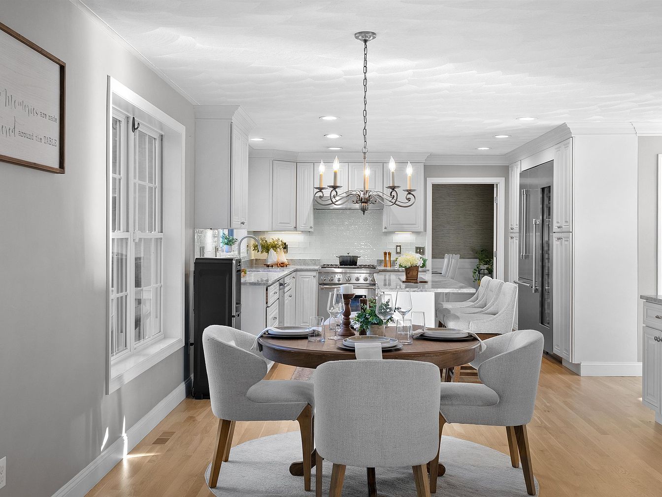 This elegant kitchen dining area features a circular wooden table surrounded by plush gray upholstered chairs. The walls are a soft gray, complementing the white cabinetry and radiant light fixtures. A large window allows natural light to flood the space, reflecting off the polished wooden floor. The kitchen is designed with modern amenities, including stainless steel appliances and a striking backsplash of subtle, textured tiles. A decorative chandelier adds charm, while potted greenery enhances the organic feel. The layout promotes an inviting atmosphere, blending functionality with a stylish aesthetic, perfect for casual meals or entertaining guests.