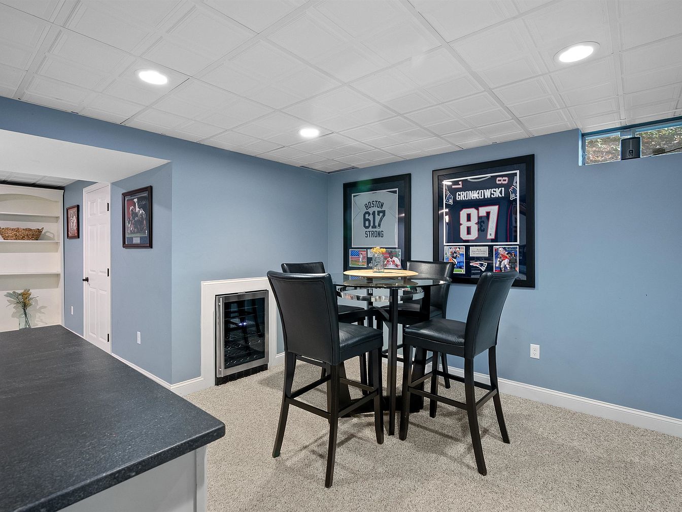 This stylish basement lounge features a soft blue color palette, casting a calming ambiance. The space includes a sleek black countertop and a round table with high-backed chairs, ideal for casual gatherings. Framed sports memorabilia adorns the walls, reflecting personal interests and enhancing character. A modern wine cooler discreetly fits into the wall, providing convenience without occupying valuable space. Flooring is plush, enhancing comfort, while recessed lighting brightens the area effectively. An open shelving unit to the left offers storage and display options. Overall, this space balances functionality with a welcoming, relaxed atmosphere.