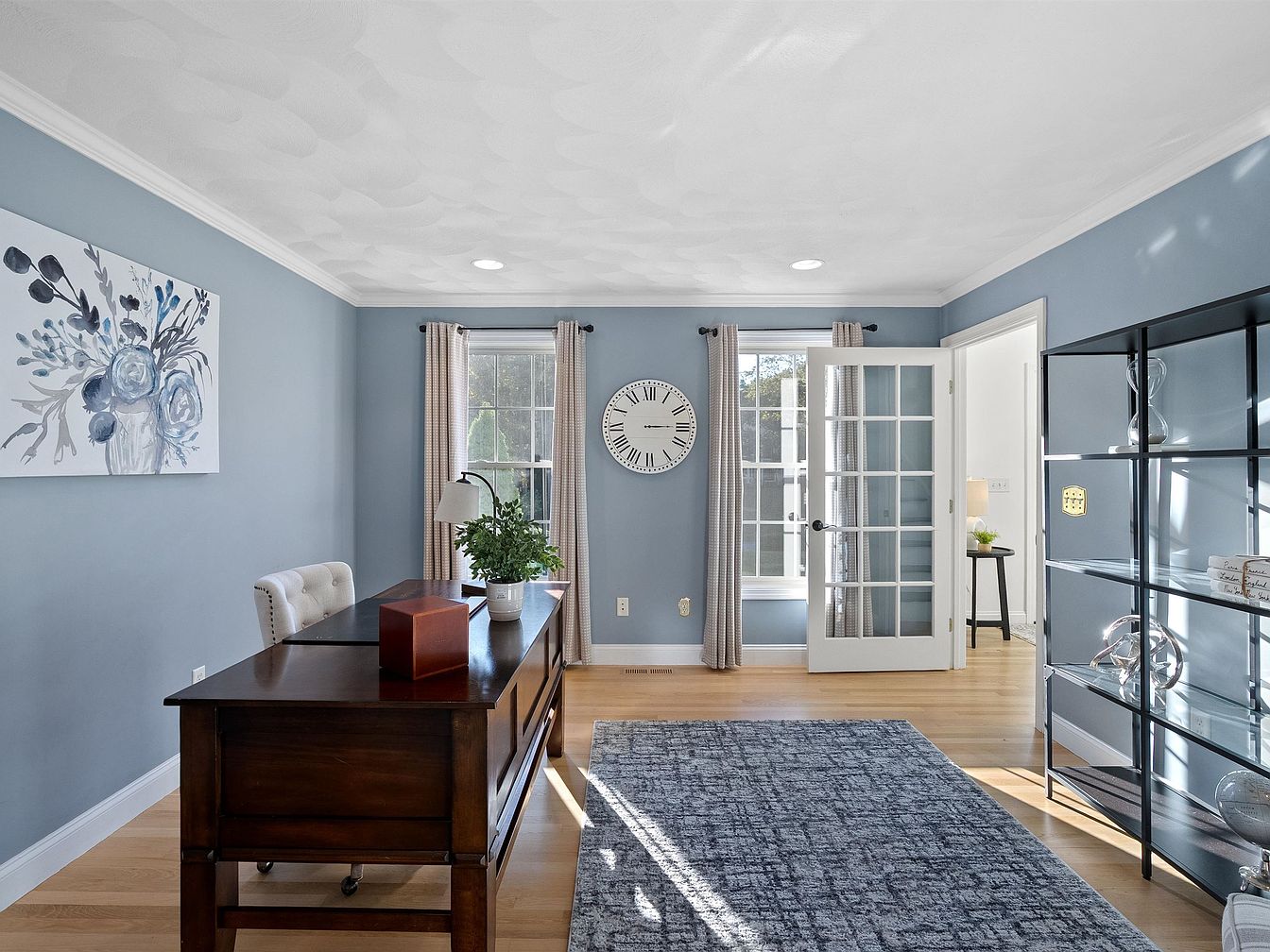 A tranquil home office features soft blue walls that create a calming atmosphere. Natural light pours in through tall windows flanked by light, patterned curtains. A sturdy dark wooden desk, complemented by a plush upholstered chair, stands as the focal point. A modern area rug with a subtle pattern adds warmth underfoot. A stylish clock hangs on the wall, while a contemporary black shelving unit displays decorative items. A small table beside the desk holds a vibrant potted plant, enhancing the room’s lively yet professional vibe. This space balances functionality with aesthetics, perfect for productivity.