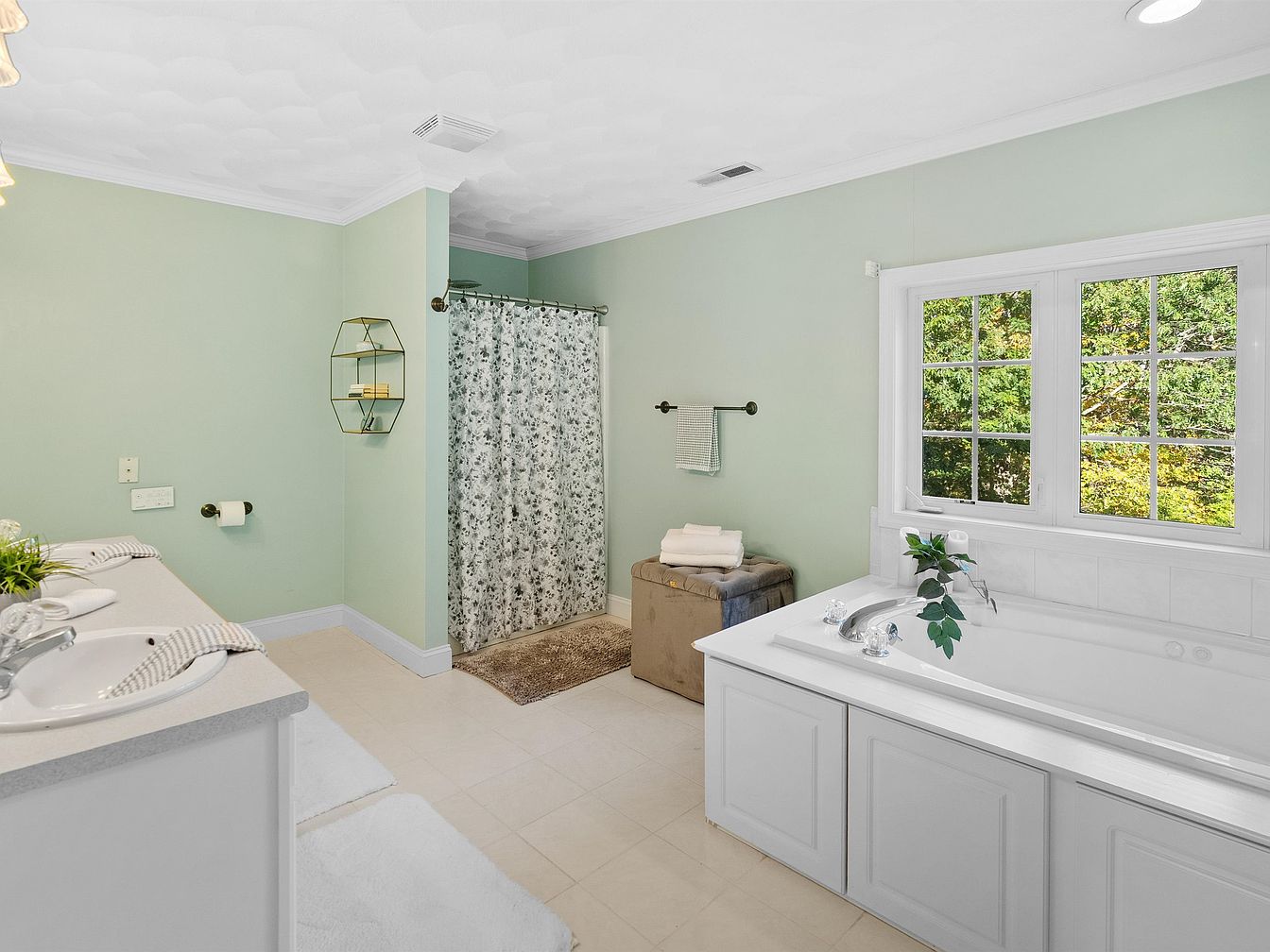 This bathroom features a serene pastel green color scheme, enhancing its calming atmosphere. The layout includes a dual sink vanity topped with a light countertop, complemented by plush towels. A stylish hexagonal shelf hangs on the wall, adding an aesthetic touch. Adjacent, a shower stall adorned with a floral curtain maintains privacy while bringing a natural element indoors. A window invites natural light, revealing a view of vibrant greenery outside. The white bathtub, with sleek fixtures, rests against the wall, showcasing a contemporary design. Overall, the space combines functionality with understated elegance, reflecting a tranquil retreat.