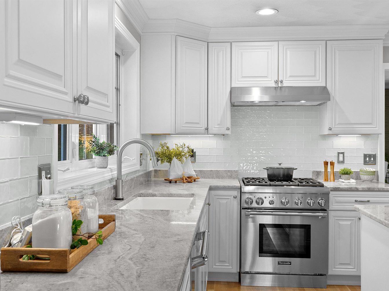 This kitchen showcases a modern design featuring crisp white cabinetry with detailed paneling and sleek hardware. The countertop, a mottled gray stone, complements the subtle textured backsplash tiles in light green shades. A contemporary stainless steel range occupies the corner, with a stylish hood above it. The window above the sink invites natural light, accompanied by potted herbs that add freshness. On the countertop, a wooden tray holds glass jars filled with ingredients, enhancing organization. The space is illuminated by under-cabinet lighting, creating a warm ambiance, while clean lines and thoughtful arrangement evoke a sense of elegance and functionality.