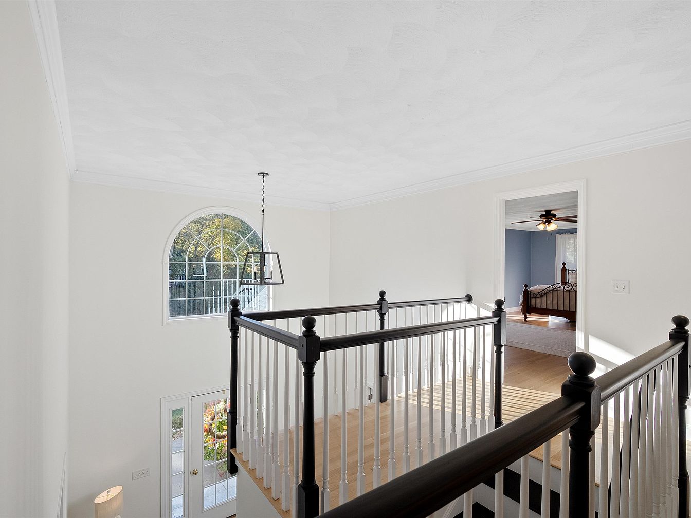 The space showcases an upper landing area, highlighted by a striking black and white color scheme. Elegant white balusters and a dark handrail frame the staircase, guiding the eye toward the soft natural light flooding through a large arched window. The walls are painted a fresh, neutral white, enhancing the bright and airy feel of the space. A minimalist pendant light hangs from the ceiling, adding a modern touch. To the right, an open doorway reveals a cozy bedroom painted in a calming blue, with a wooden bed frame visible in the background, contributing a warm and inviting atmosphere.