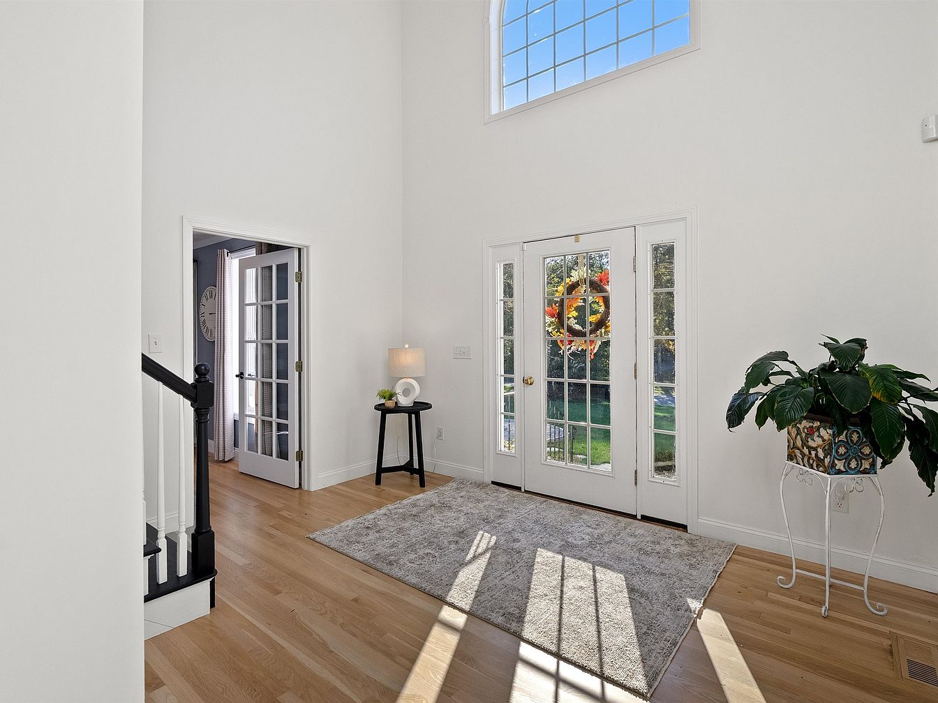 The entryway showcases a bright, airy ambiance, highlighted by high ceilings and a large arched window that fills the space with natural light. Neutral white walls contrast beautifully with the warm wooden tones of the floor, enhancing the inviting feel. A soft area rug lies centrally on the floor, while a slender table with a modern lamp and a small plant adds a touch of elegance. Double French doors open to another room, framed by subtle drapes. A striking seasonal wreath adorns the front door, introducing a welcoming charm that complements the overall aesthetic.