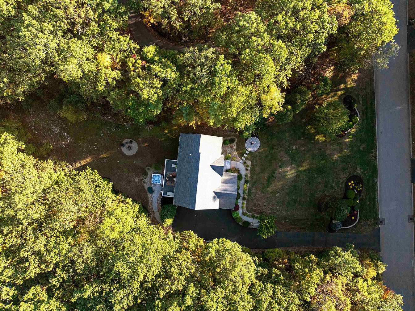 The image presents an aerial perspective of a historic American home surrounded by lush greenery. The house features a symmetrical layout with a gray roof and a charming front porch, emphasizing its inviting character. A circular stone patio is visible, adorned with furniture, perfect for outdoor gatherings. Flanking pathways lead through a manicured lawn, bordered by trees and landscaped hedges that enhance the natural setting. The colors are dominated by rich greens from the foliage, complemented by earth tones in the stonework and the home’s exterior, creating a harmonious blend with the environment.