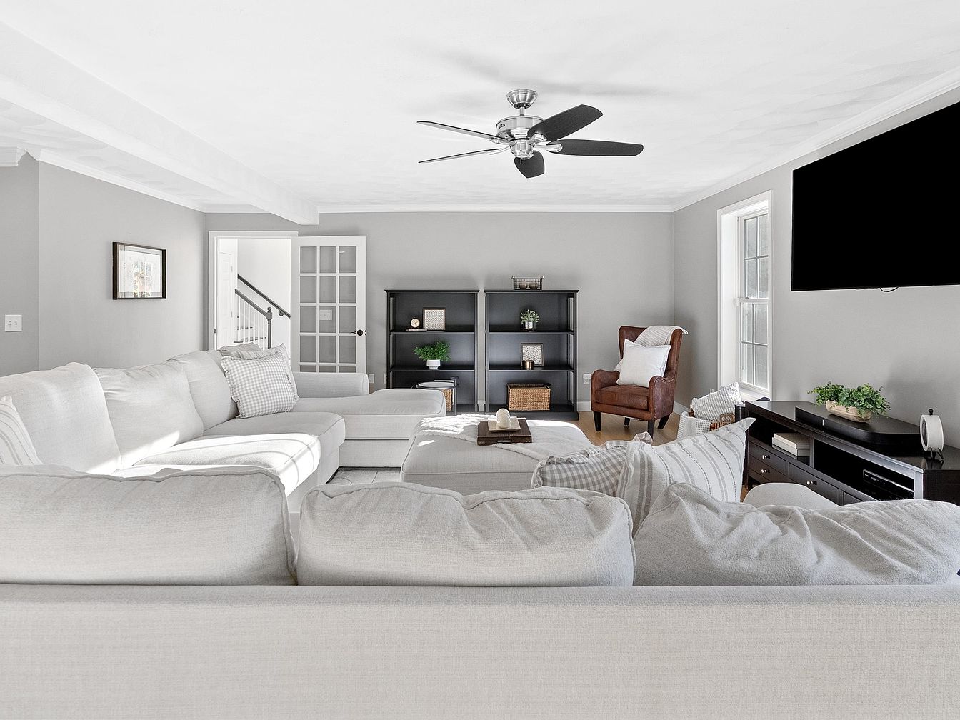A spacious living room adorned with soft neutral tones creates a cozy atmosphere. The large sectional sofa, upholstered in light fabric, features an array of plush throw pillows, enhancing comfort. Natural light filters through several windows, illuminating the room and reflecting off the smooth, pale wood flooring. A rustic stone fireplace serves as a focal point, adding warmth, while a round coffee table, topped with decorative accents, invites gatherings. The walls are painted in a soft gray, complemented by decorative elements like a modern ceiling fan and potted greenery, providing a seamless blend of style and relaxation.